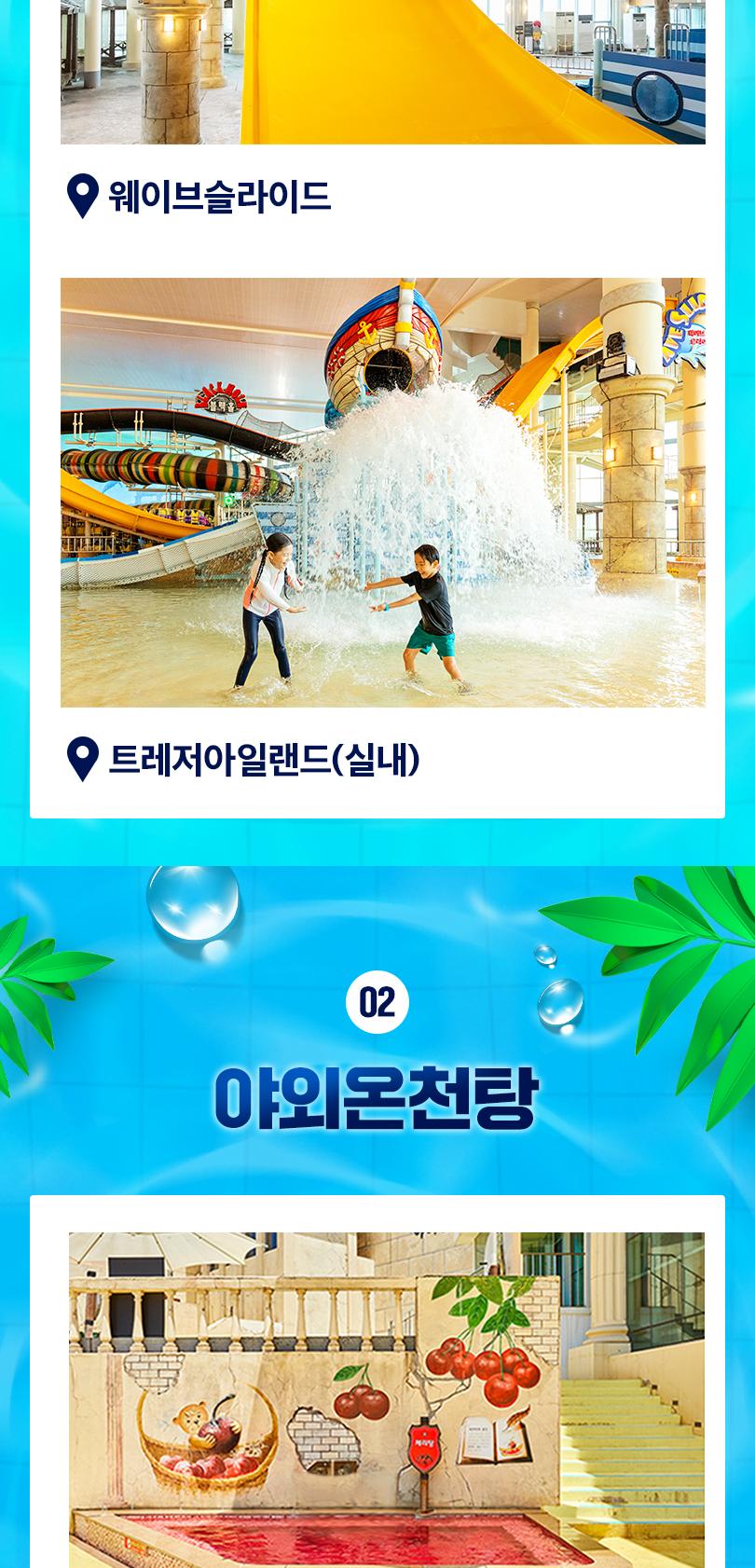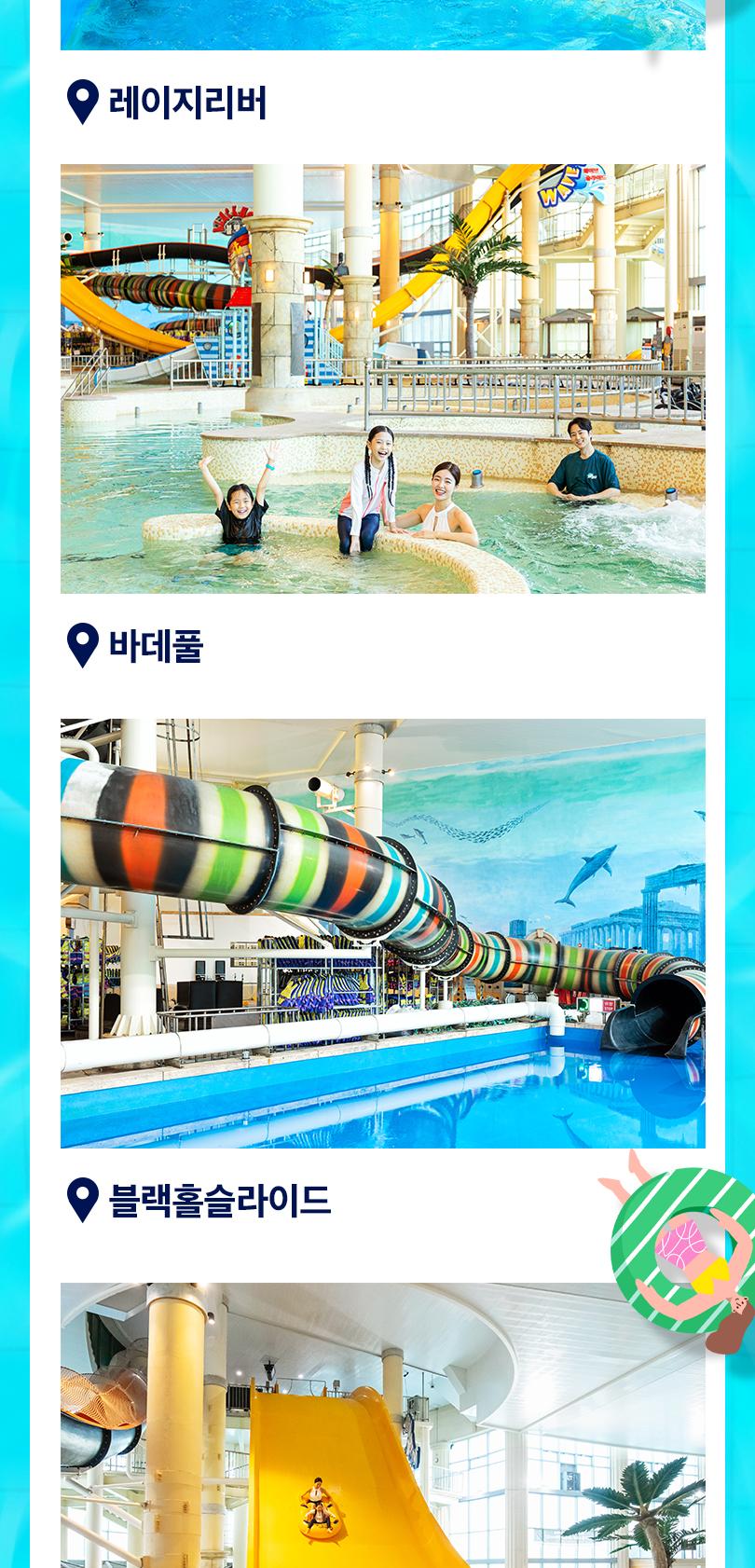베스트어딜갈까고민하다가 다녀왔는데, 규모는 크지 않았지만 정말 알차고 재밌게 놀다왔어요. 파도풀에서는 좀춥다고 생각했었는데, 얼마나 오래있었는지 춥지도않고 재밌더라고요. 파도풀을지나 터널지날때는 따뜻한물로인해서 수증기가 가득하니 애들이 너무 재미있어했고요. 키가 작아서 놀이기구는 이용못했지만 담에 또 가려고요~~^^