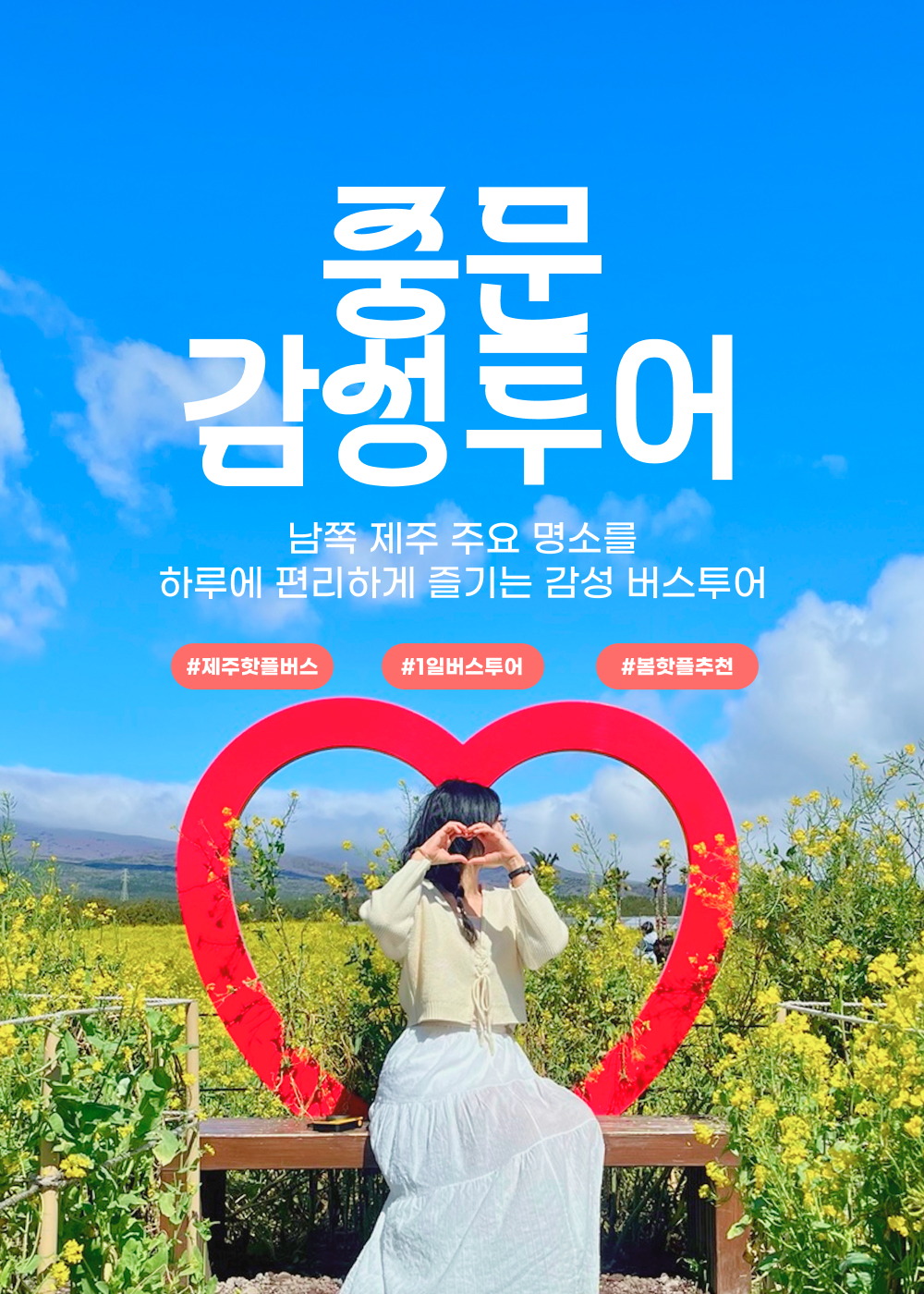 아름다운 청정자연을 가진 섬이지만 뚜벅이에게는 망설여지는 제주 여행! 차가 없어도 쉽게 만끽할 수 있는 일일 버스 투어를 소개할게요. 제주 투어 전문가가 엄선해 기획한 코스를 기사님이 운전해 주시는 버스를 타고 편안하게 방문하고, 목적지에서는 자유롭게 여행을 즐길 수 있어 패키지 투어와 자유여행의 장점을 모두 가지고 있어요.