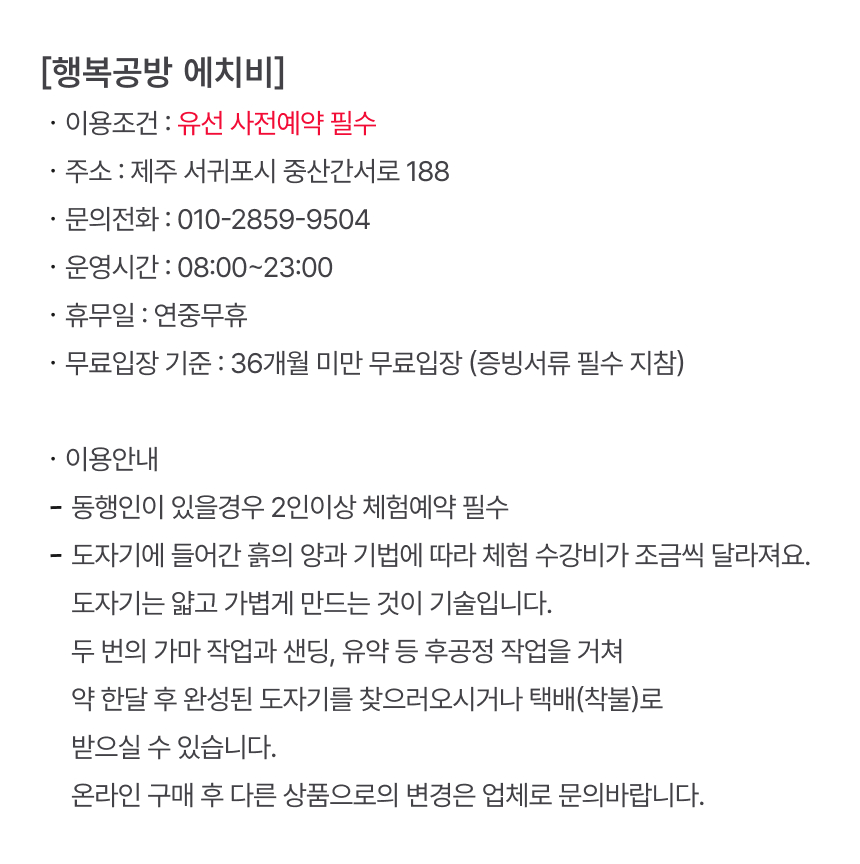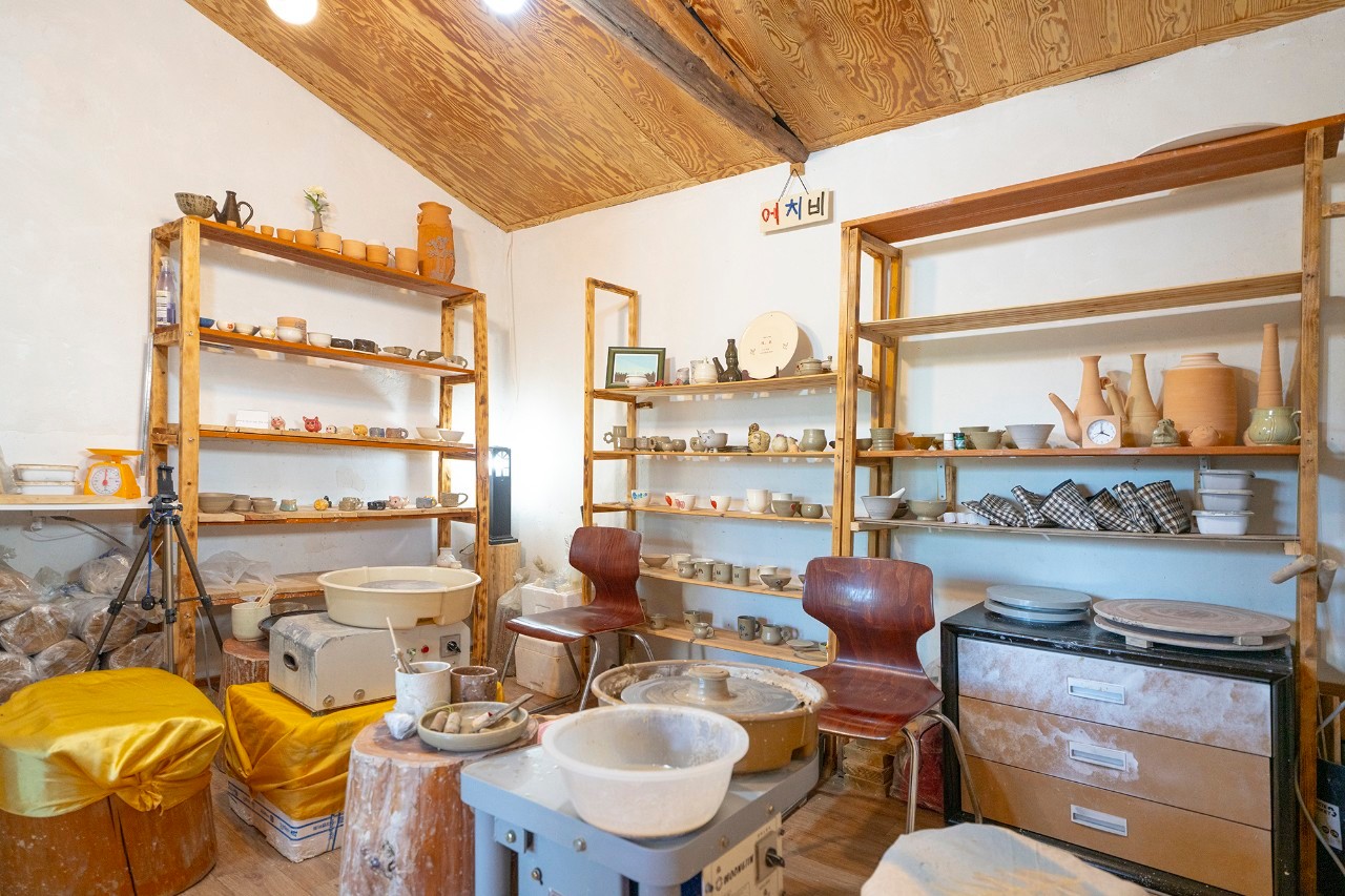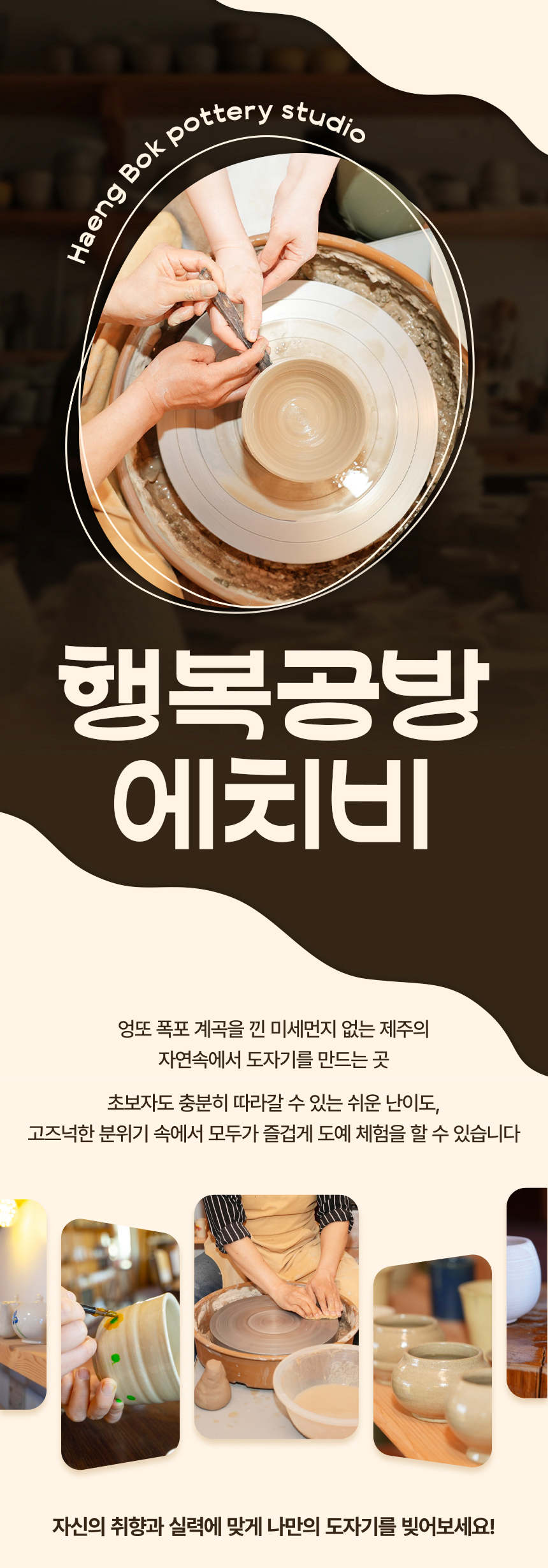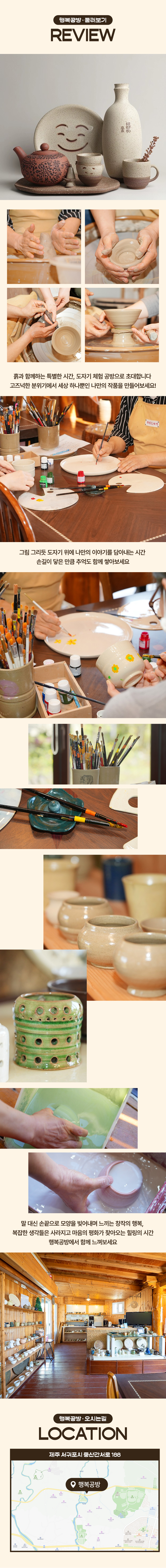 전문 강사의 지도 아래에서 손으로 모양을 잡고 마음에 드는 색으로 도자기를 빚어보며 세상에 하나밖에 없는 나만의 도자기를 만들 수 있어요. 행복공방 에치비에서 빚은 도자기를 제주 여행의 기념품으로 간직해 보세요!