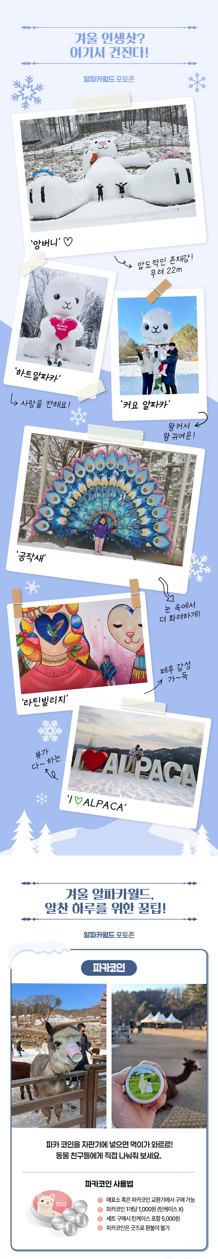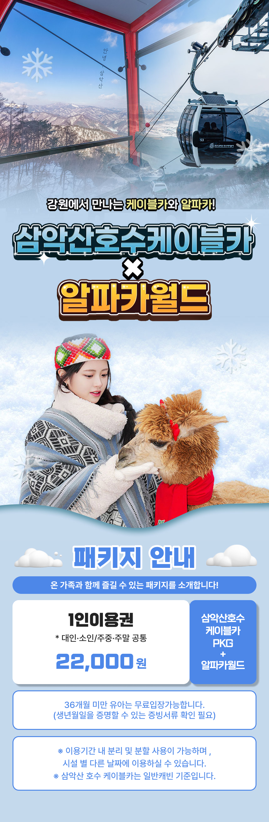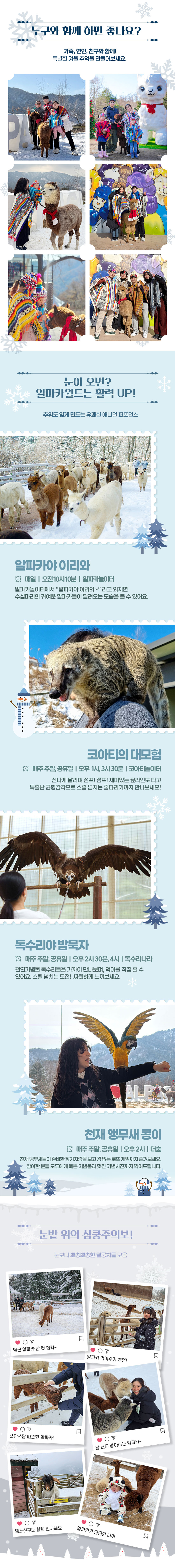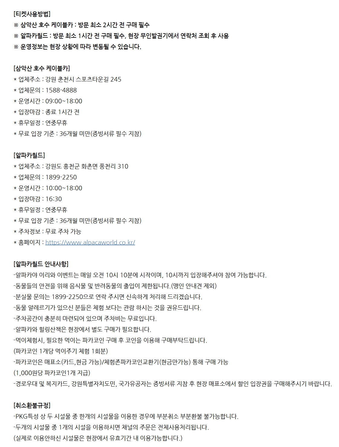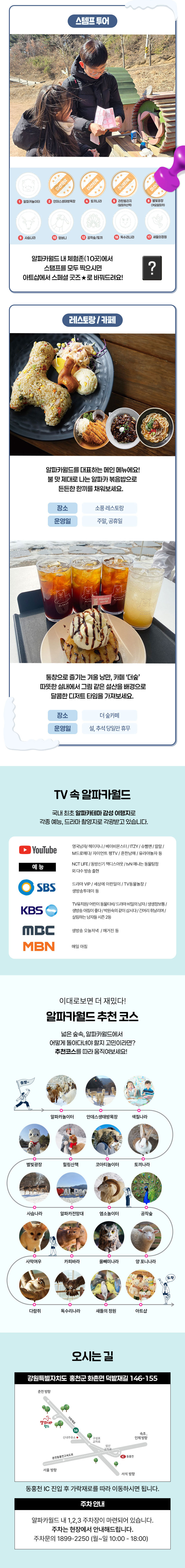 국내 최장 3.61km의 삼악산 호수 케이블카를 타고 의암호 위를 가로지르며 펼쳐지는 춘천의 절경을 한눈에 담아보세요. 발아래로 이어지는 투명한 호수와 굽이치는 산 능선이 어우러진 파노라마 풍경은 일상에서 쉽게 경험할 수 없는 특별한 감동을 선사합니다. 케이블카 이후 이어지는 산책로와 스카이워크에서는 탁 트인 자연 속에서 짜릿한 개방감과 여유로운 힐링을 동시에 느낄 수 있습니다. 이어서 방문하는 알파카월드에서는 맑은 눈망울을 가진 알파카들과 함께 숲길을 걸으며 교감하는 특별한 시간을 보낼 수 있어요. 부드러운 털과 따뜻한 온기를 가까이에서 느끼며 아이부터 어른까지 모두가 미소 짓게 되는 경험을 선사합니다. 하늘 위에서의 절경과 숲속에서의 따뜻한 교감이 어우러진 이 패키지는 자연과 감성을 동시에 채워주며, 춘천에서의 하루를 더욱 특별한 추억으로 완성해줍니다.