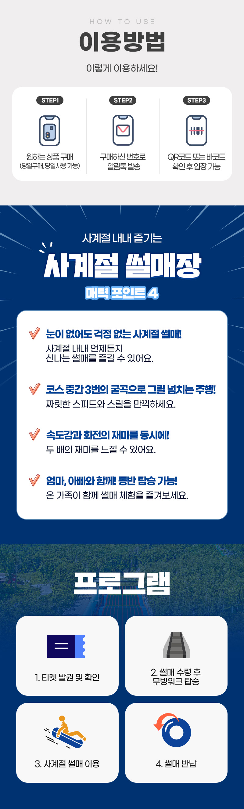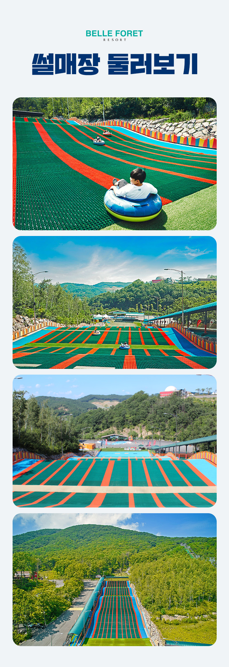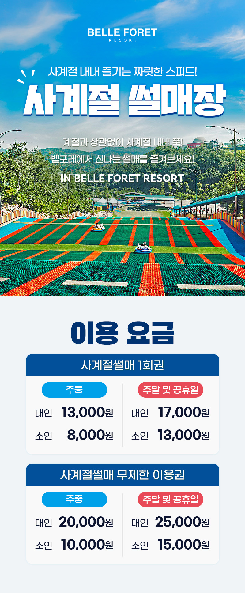 한국어 제공계절에 관계없이 즐길 수 있어 더욱 좋은 사계절썰매! 벨포레에서 즐겨보세요. 사계절썰매는 튜브를 타고 슬로프를 내려오는 레포츠로 시원한 공기와 짜릿한 속도감을 즐길 수 있어요. 아이가 어려도 동반탑승으로 함께 즐길 수 있으니 남녀노소 모두 사계절 썰매를 타고 신나게 달려보세요.