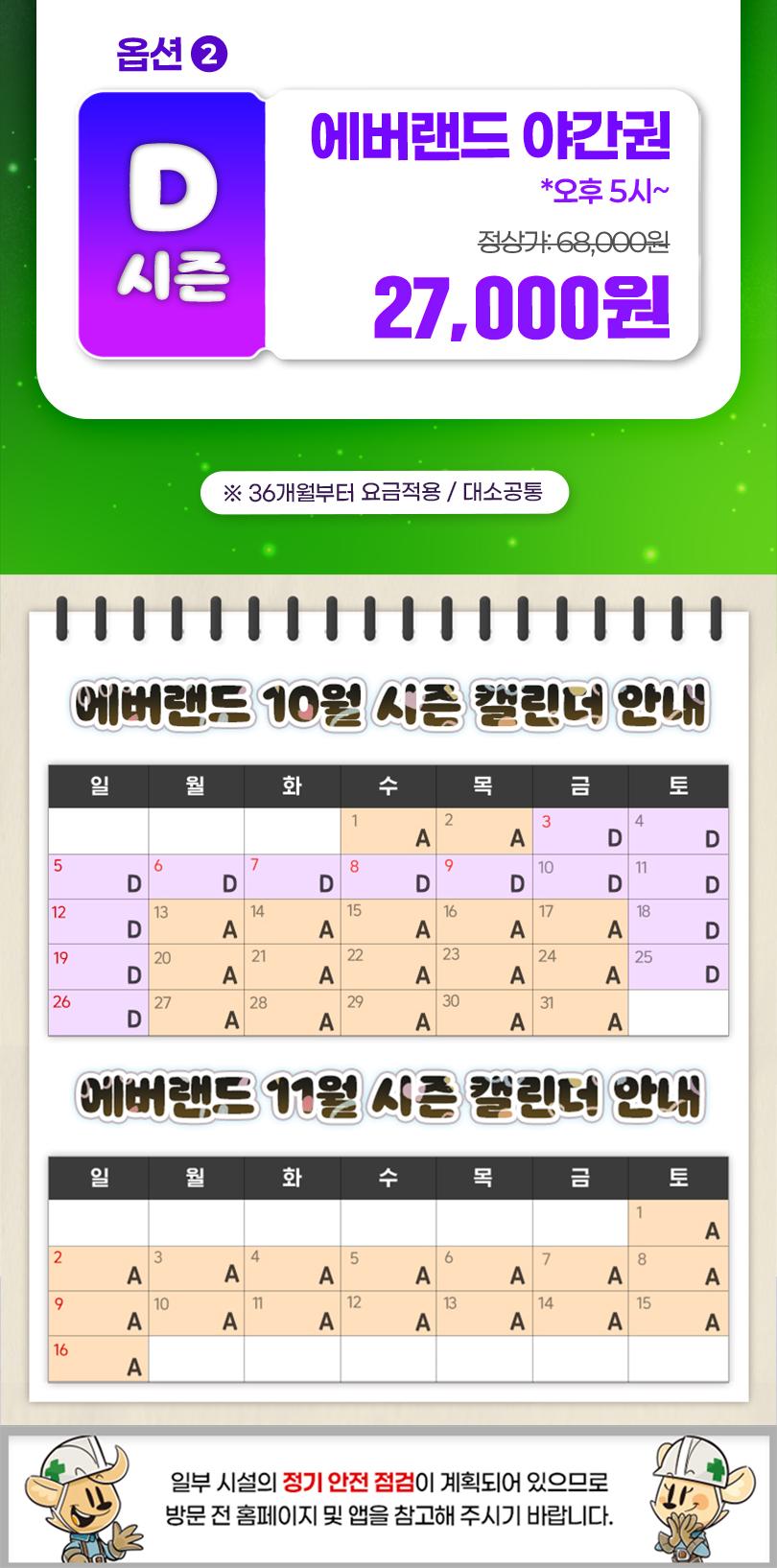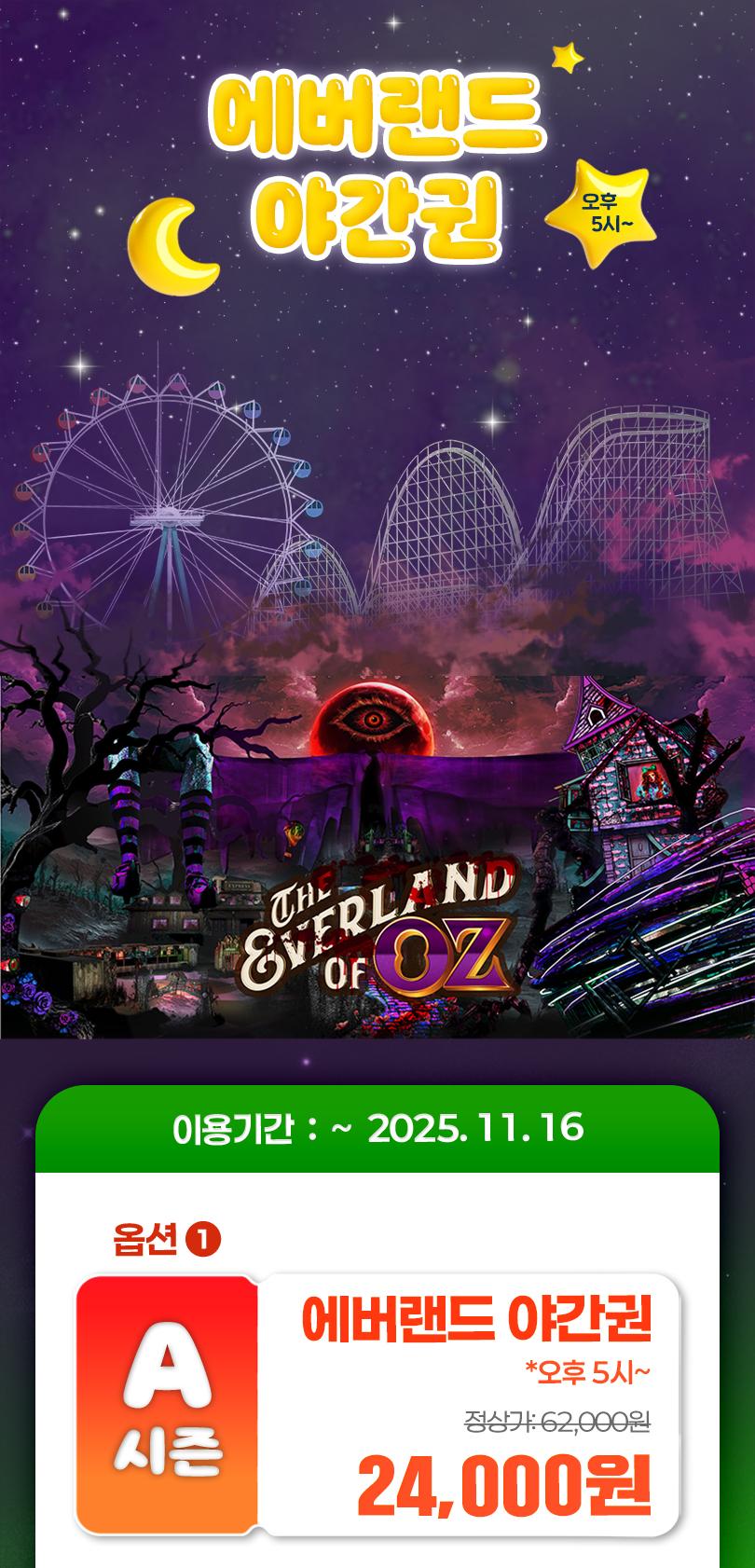 🎡 낮에는 짜릿한 어트랙션, 밤에는 반짝이는 야경! 지금 에버랜드 특가로 즐거움을 만끽하세요! 🌟🎠 판매기간 : 2025.10.20 ~ 2025.11.16 유효기간 : ~ 2025.11.16 야간권 : 오후 5시 이후 입장