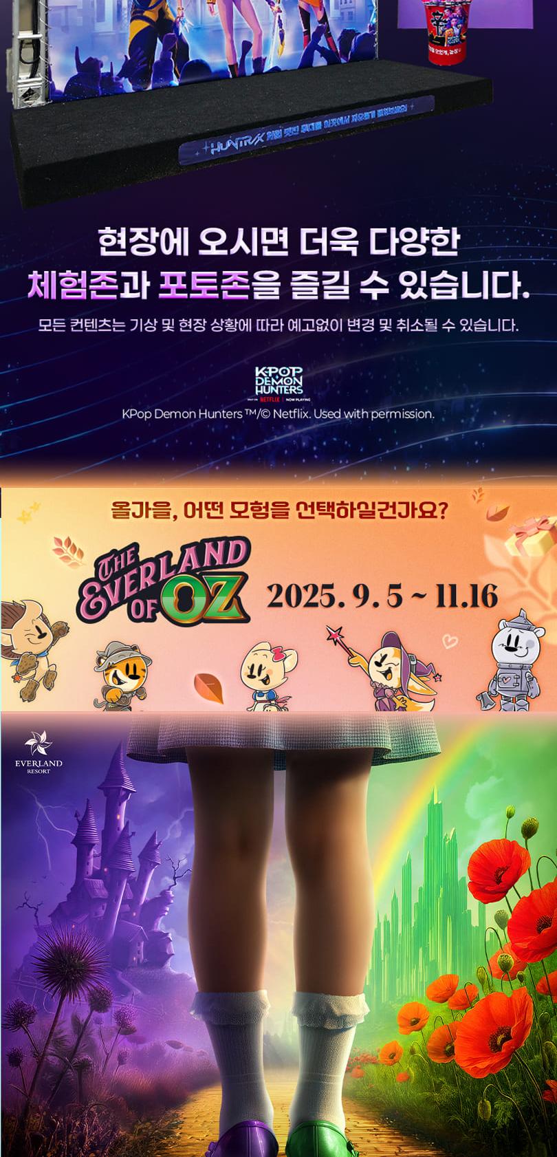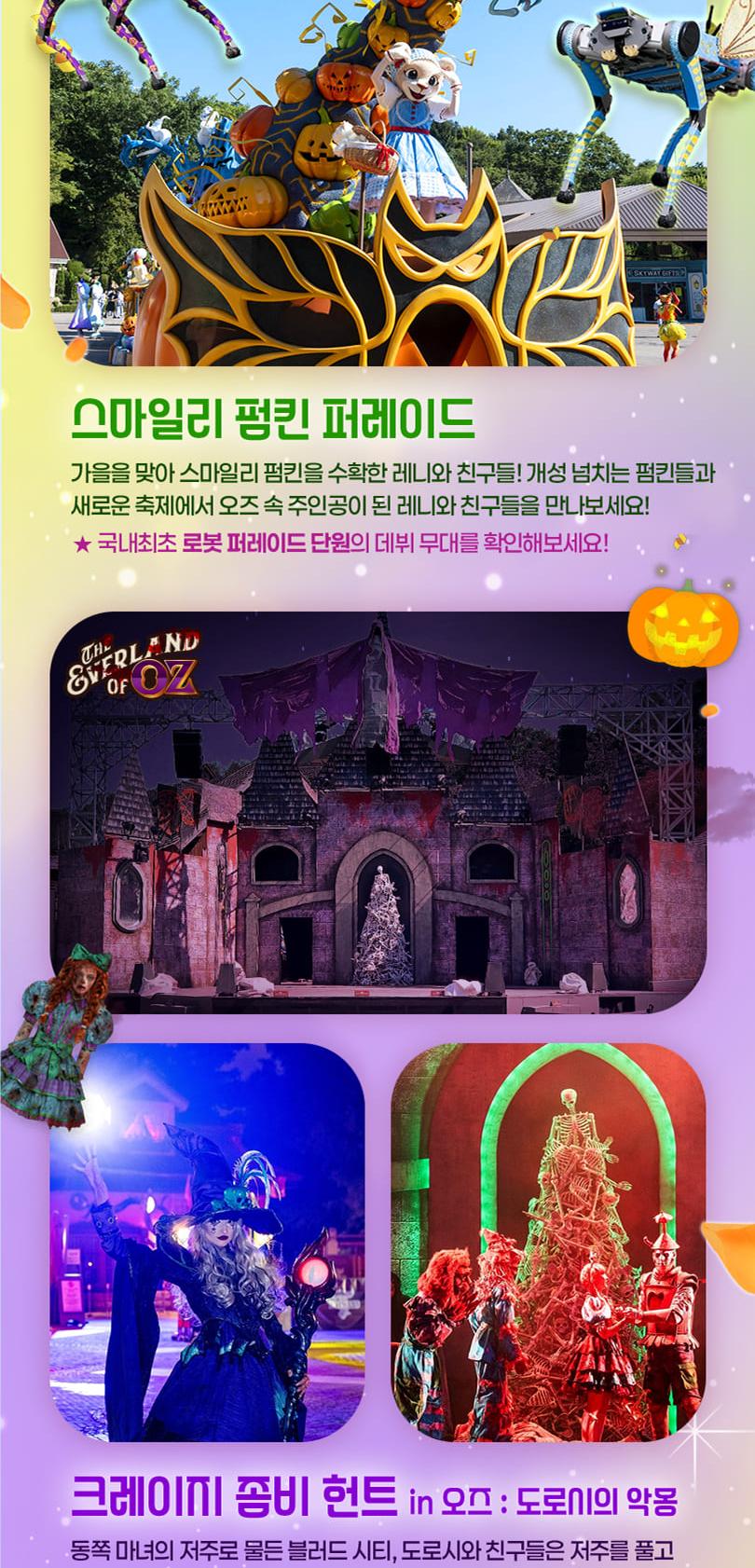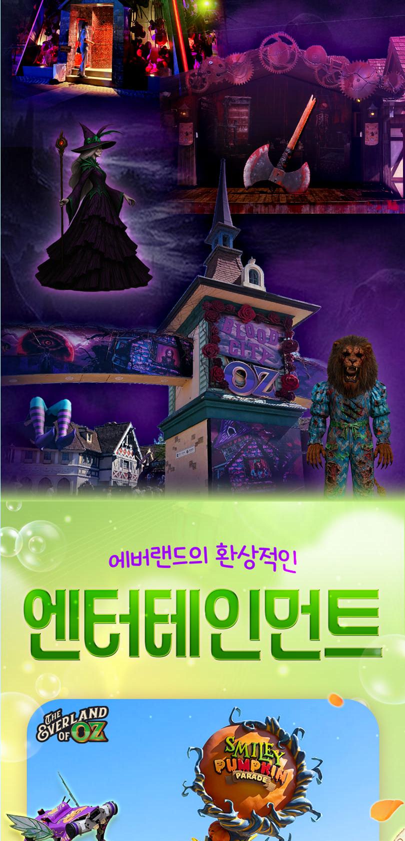 에버랜드는 가을에도 역시 에버랜드만의 다양한 축제와 이벤트로 가득해요. 특히 가을 에버랜드의 하이라이트는 역시 공포체험이죠! 이름만 들어도 무서운 호러메이즈 블러드시티에서 등골 오싹한 호러에 도전해 보세요. 티익스프레스, 아마존 등 짜릿한 에버랜드 대표 어트랙션은 물론, 요즘 에버랜드에서 가장 핫한 쌍둥이 아기판다 루이바오, 후이바오의 장난스러운 모습까지 에버랜드에서 확인해 보세요.
