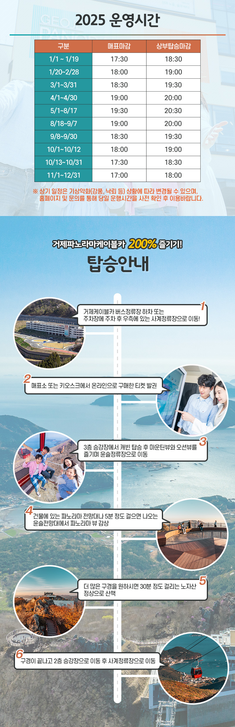 거제 파노라마 케이블카는 학동고개에서 노자산 정상을 연결하는 1.56km 구간의 케이블카로 상부전망대에서는 노자산과 다도해 전경을 경계없이 360도 모든 곳을 둘러볼 수 있습니다. 푸른 하늘과 노을, 산과 바다, 섬과 육지 오직 거제에서만 볼 수 있는 자연이 주는 풍경 안에서 여유를 즐겨보세요.
