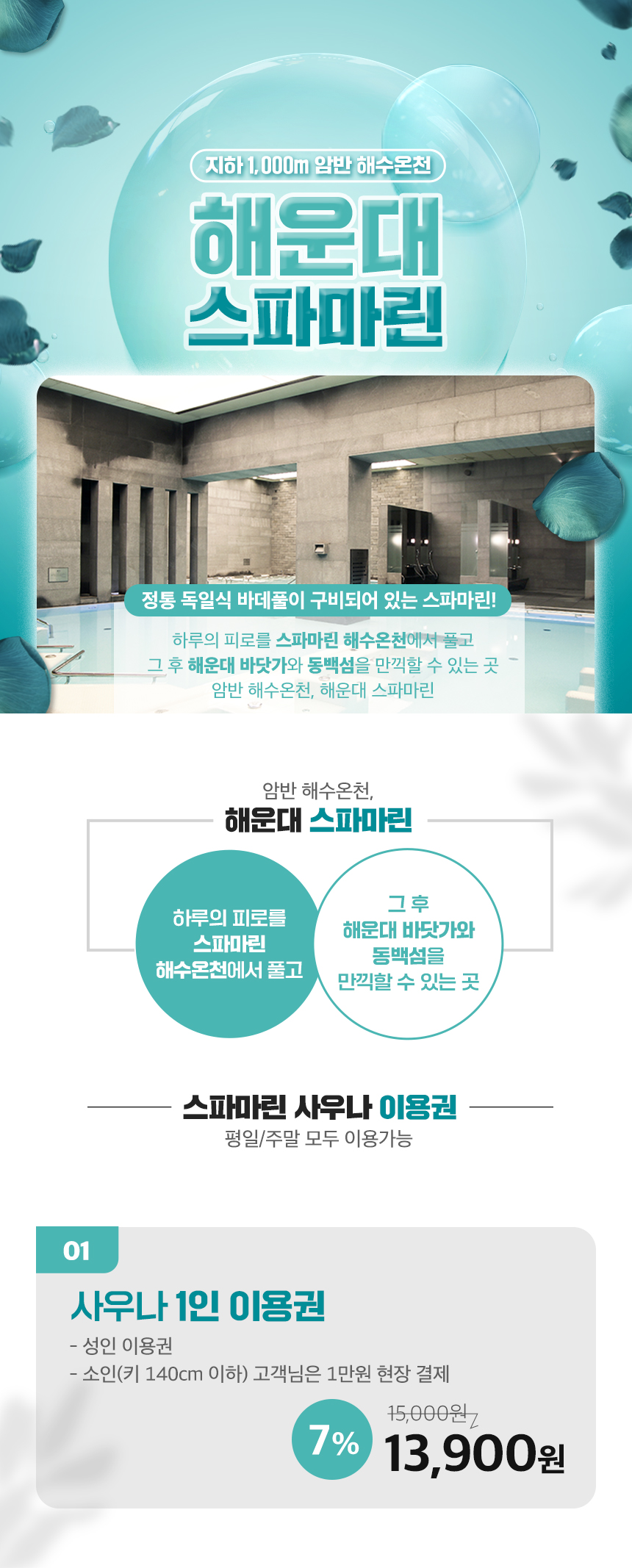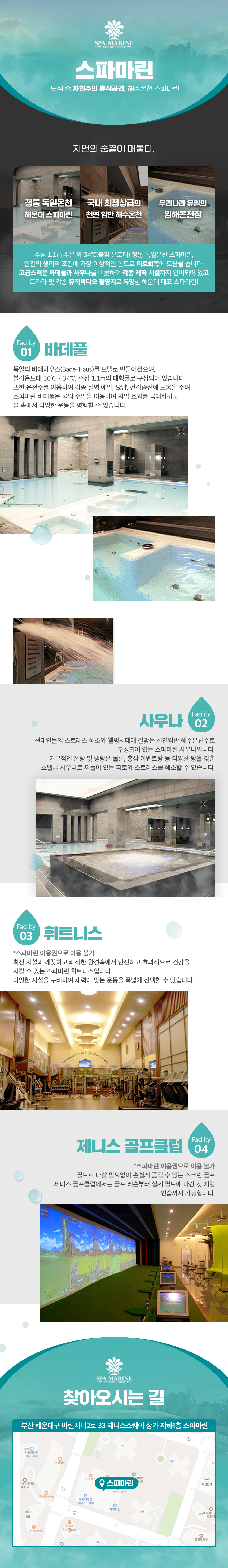 지하 1,000m 암반 해수온천 '해운대 스파마린' 정통 동일식 바데풀이 구비되어 있는 스파마린! 하루의 피로를 스파마린 해수온천에서 풀고 그 후 해운대 바닷가와 동백섬을 만끽할 수 있는 곳 암반 해수온천, 해운대 스파마린!