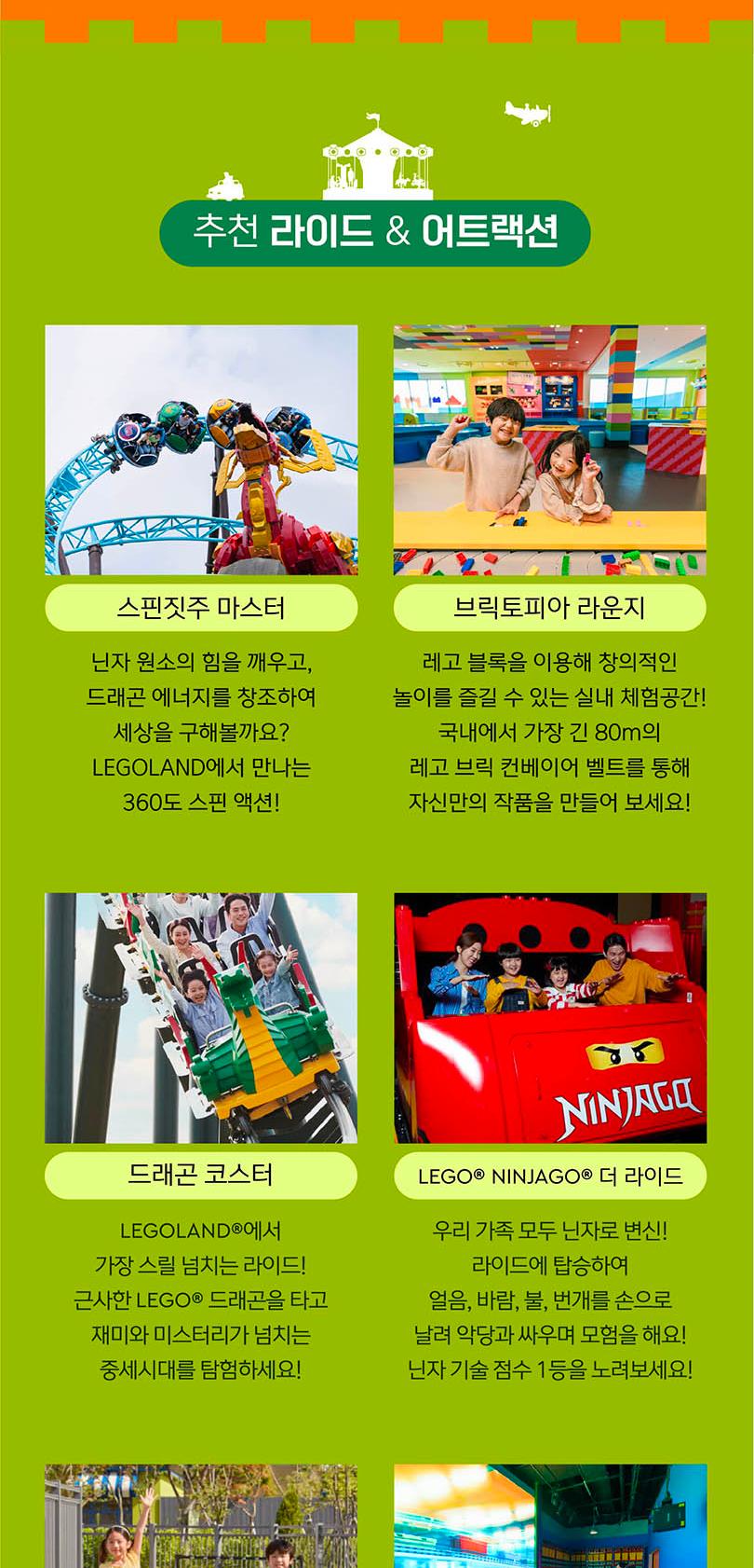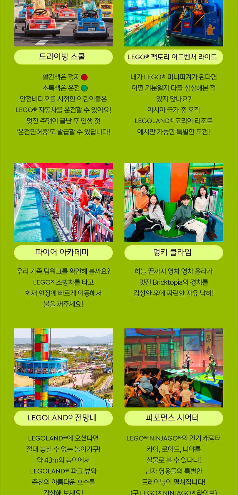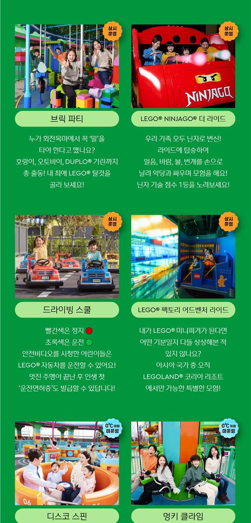 레고랜드는 독일, 플로리다, 일본, 뉴욕 등에 이어 세계 10번째로 한국에 개장한 국내 첫 글로벌 테마파크로 어린이 동반 가족에게 딱 맞는 놀이기구와 어트랙션, 그리고 퍼포먼스로 구성되어 있어요. 40여 개의 레고를 테마로 한 놀이기구들과 함께 신나는 모험으로 가득한 하루를 보내고 흥미진진한 추억을 쌓아보세요. 레고랜드 영상으로 미리보기