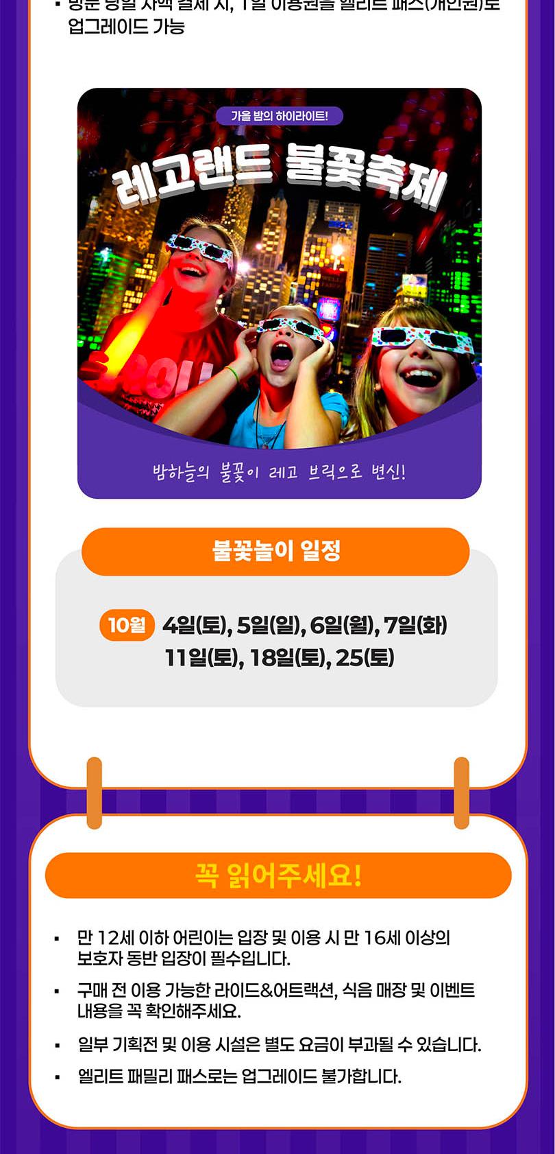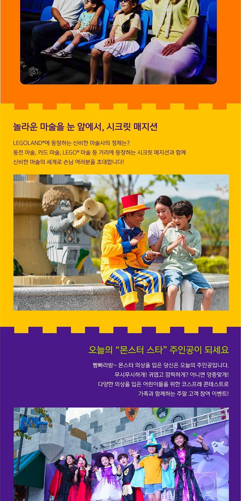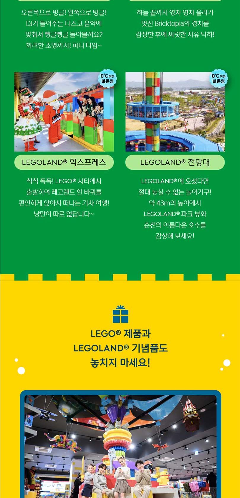 레고랜드는 독일, 플로리다, 일본, 뉴욕 등에 이어 세계 10번째로 한국에 개장한 국내 첫 글로벌 테마파크로 어린이 동반 가족에게 딱 맞는 놀이기구와 어트랙션, 그리고 퍼포먼스로 구성되어 있어요. 40여 개의 레고를 테마로 한 놀이기구들과 함께 신나는 모험으로 가득한 하루를 보내고 흥미진진한 추억을 쌓아보세요. 레고랜드 영상으로 미리보기