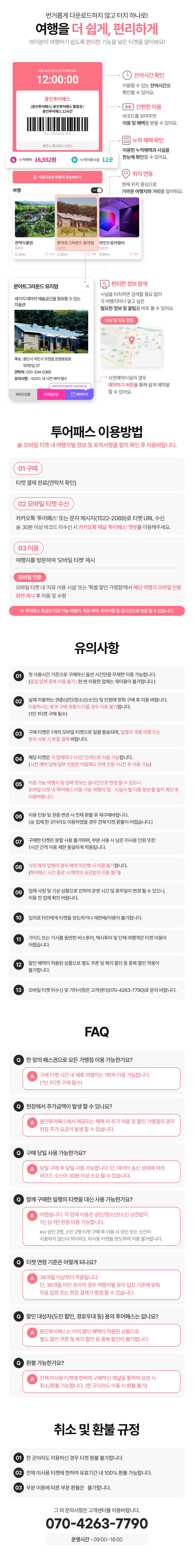 가족 나들이로 인기 있는 용인! 투어패스와 함께 더욱 알뜰하고 똑똑하게 용인을 즐겨보세요. 용인투어패스는 72시간 동안 용인의 다양한 투어패스 제휴처를 자유롭게 이용 가능한 티켓으로 별도의 어플 다운 없이 구매 시 발송되는 링크 내의 바코드를 제시하면 다양한 혜택을 즐길 수 있어 쉬운 여행이 가능해요. 투어패스와 함께 용인의 미술관, 테마파크 등을 방문하고 즐거운 추억을 만들어 보세요.