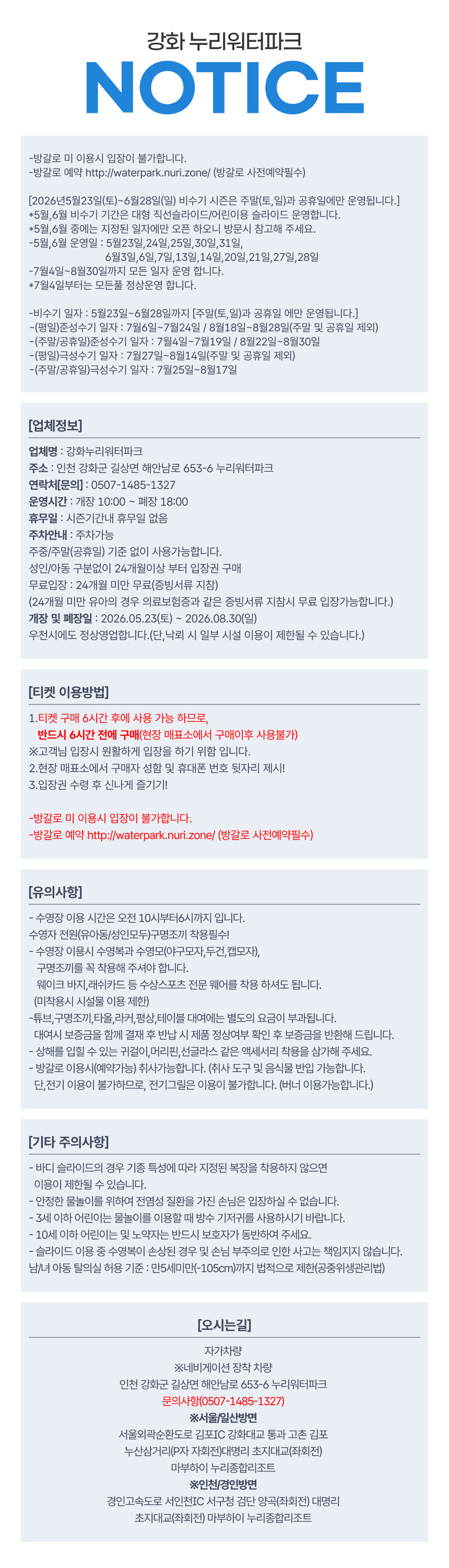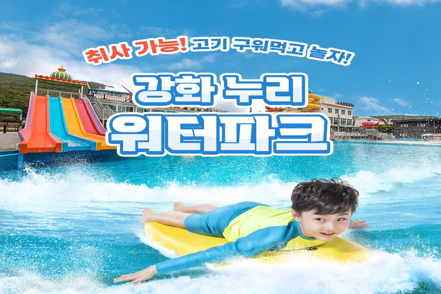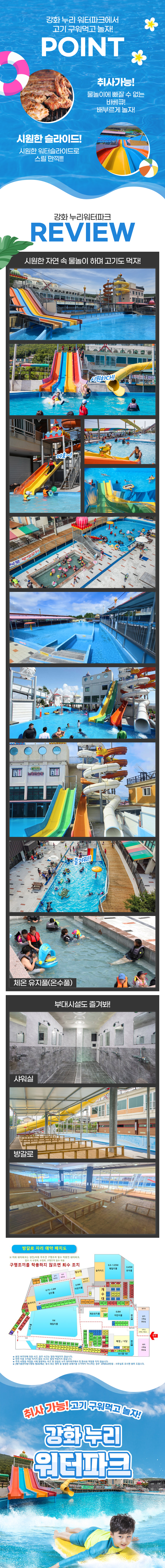 강화도 바닷가 인근의 누리워터파크는 물이 시원하고 쾌적하기로 유명해요. 다양한 크기와 깊이의 풀장과 아이들을 위한 유아풀, 여유롭게 떠다닐 수 있는 유수풀은 물론 짜릿한 슬라이드와 따뜻한 체온유지풀까지 알차게 구성되어 있어요.