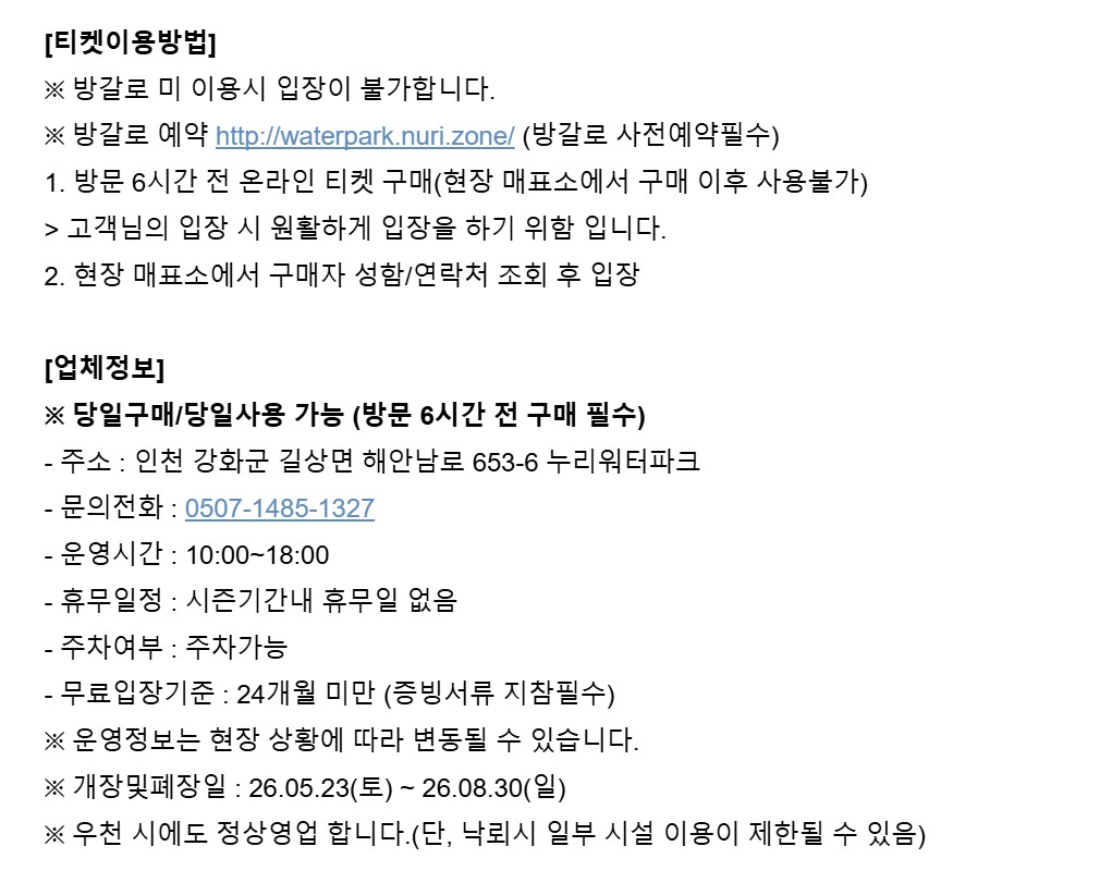 베스트인천에서 진짜 가깝게 갈만한 워터파크를 찾아보는데 강화 누리크가 유명하더라고요 바로 네이버에서 검색해서 WAUG 에서 바로 결제 완료 그리고 이거 결제가 끝이 아니라 카티지도 따로 결제 해야되요 아이가 너무 좋아하네요^^ 또가려고 지금 또 예약 하고 있습니다