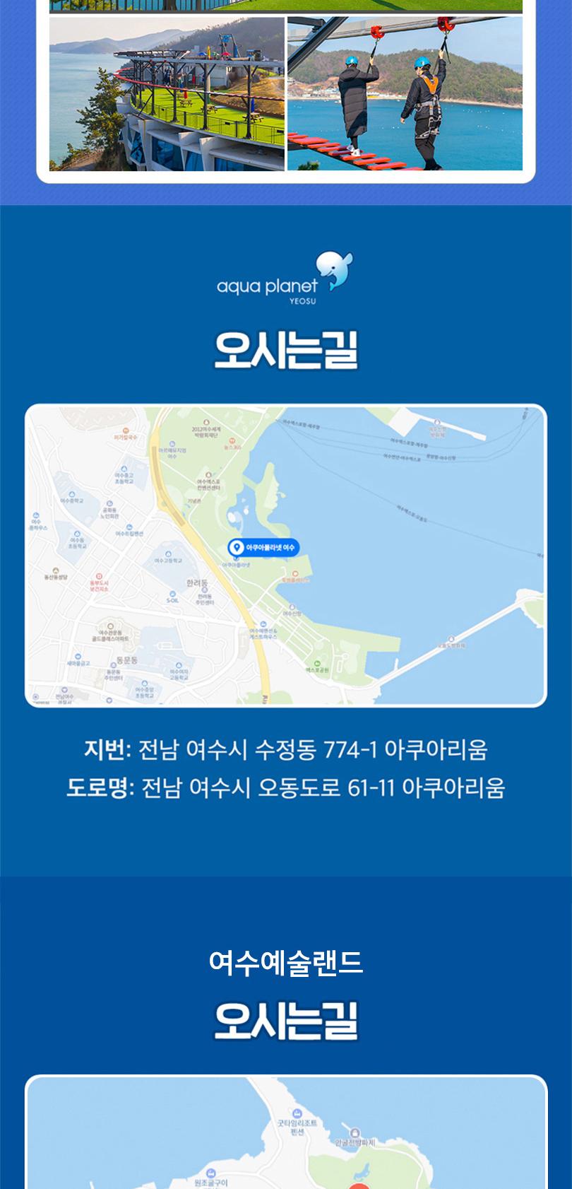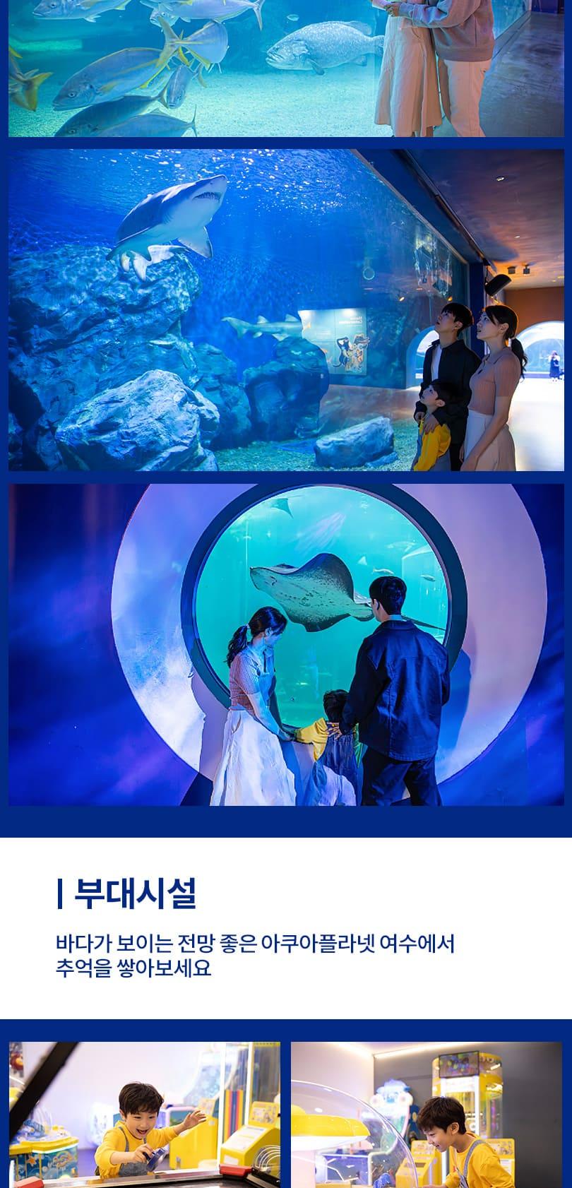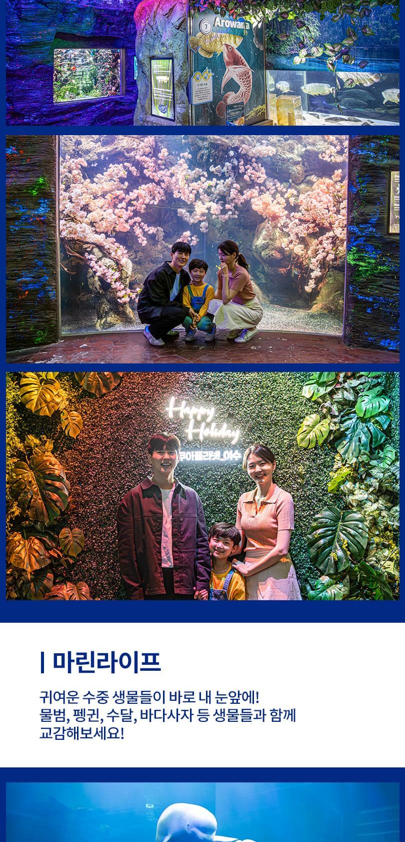 한국어 제공여수 필수 관광지, 아쿠아플라넷과 예술랜드를 합리적인 가격의 패키지로 편하게 즐겨보세요. 여수 아쿠아플라넷에서는 300여 종 5만 5000여 마리의 해양생물을 만나볼 수 있어요. 각 층의 오션라이프, 마린라이프, 아쿠아 포리스트 등 차별화된 체험 전시공간을 즐기며 바다 생물의 신비함과 소중함을 경험해 보세요.