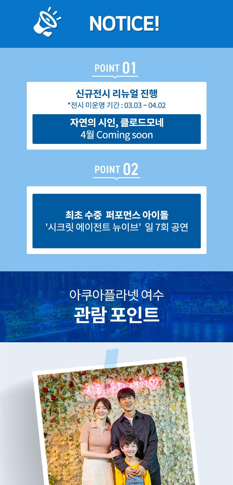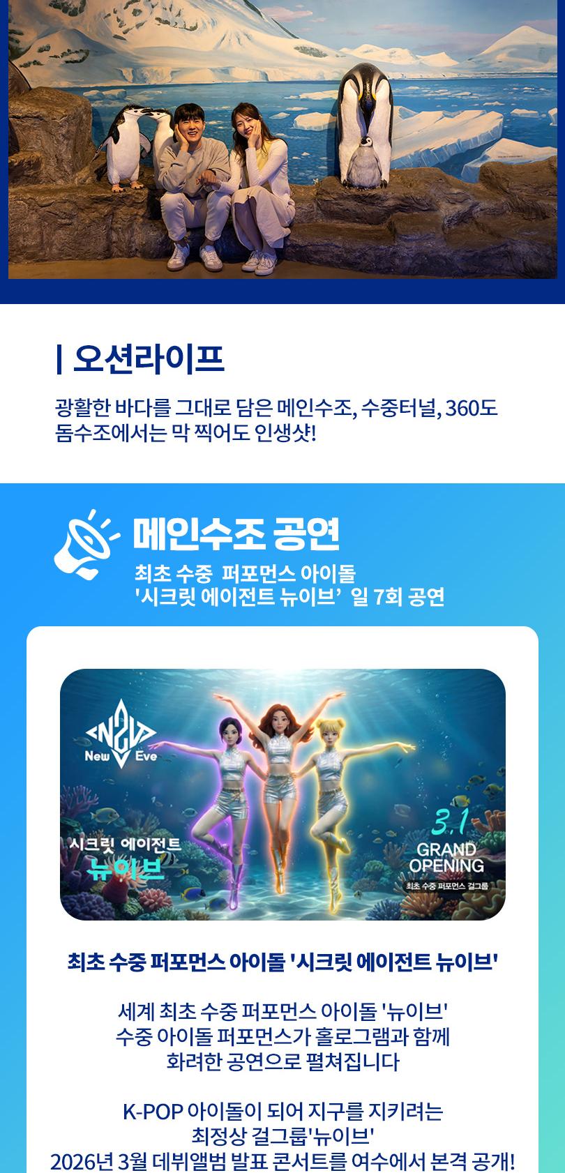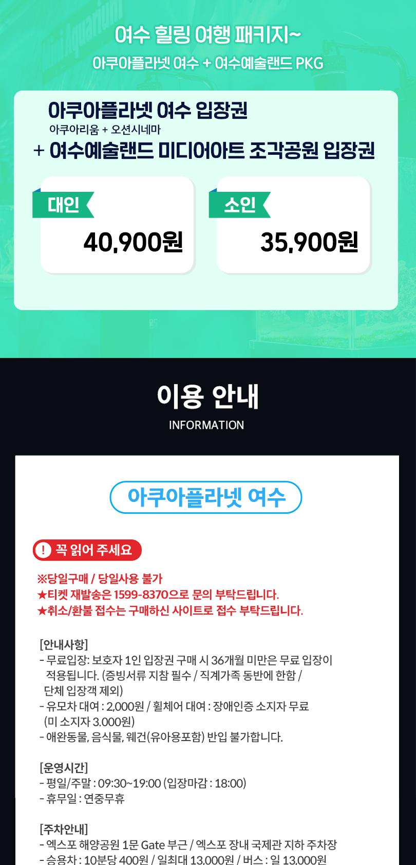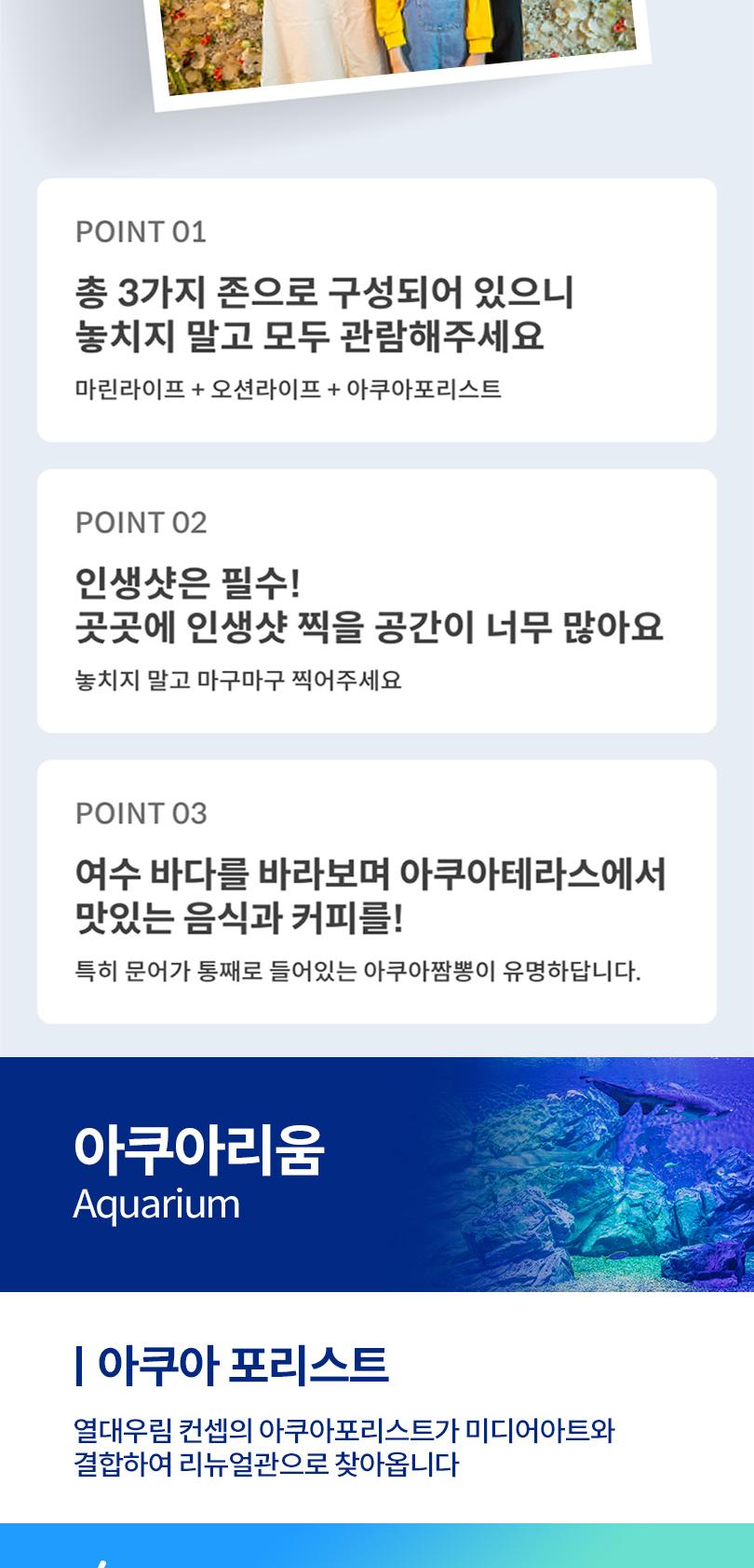 한국어 제공여수 필수 관광지, 아쿠아플라넷과 예술랜드를 합리적인 가격의 패키지로 편하게 즐겨보세요. 여수 아쿠아플라넷에서는 300여 종 5만 5000여 마리의 해양생물을 만나볼 수 있어요. 각 층의 오션라이프, 마린라이프, 아쿠아 포리스트 등 차별화된 체험 전시공간을 즐기며 바다 생물의 신비함과 소중함을 경험해 보세요.