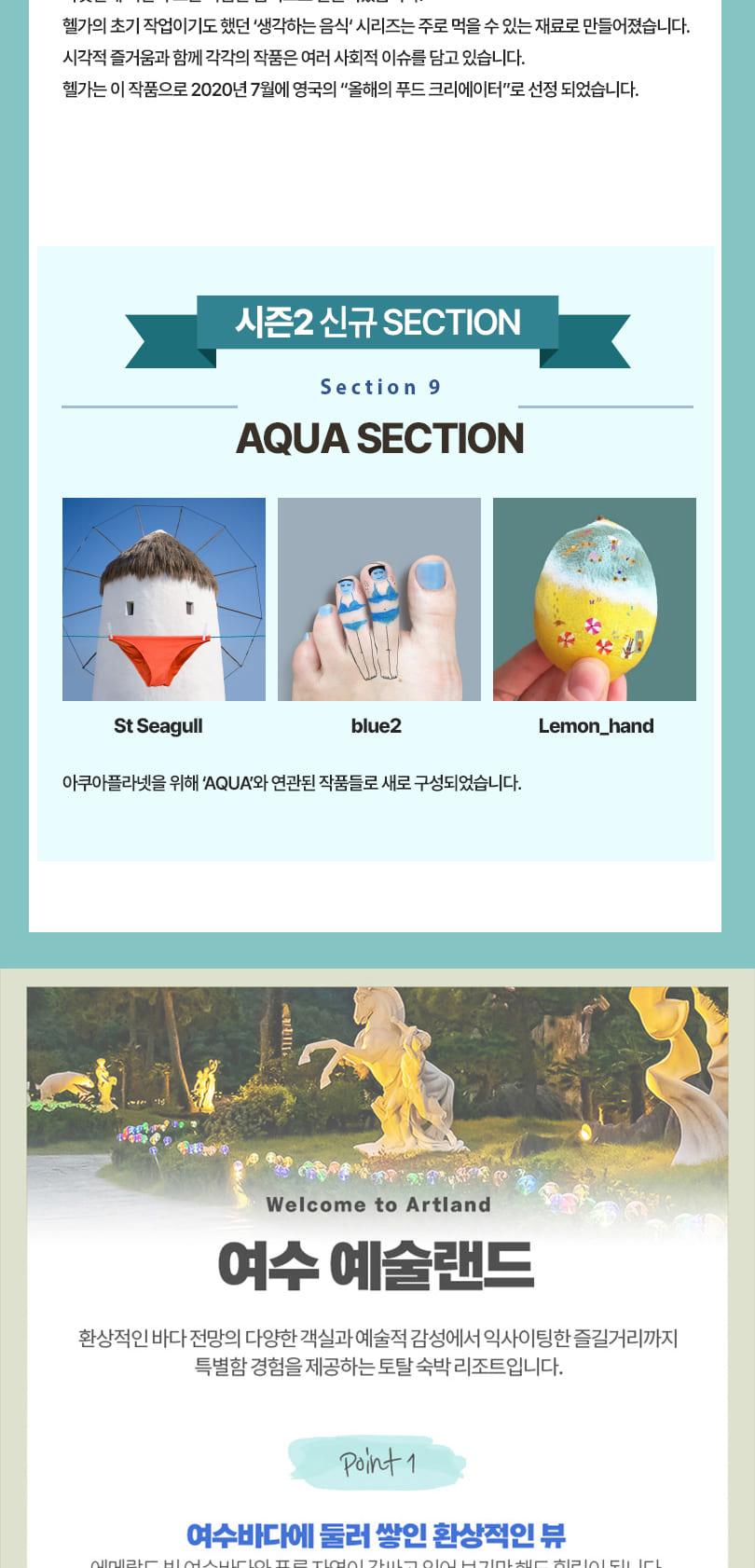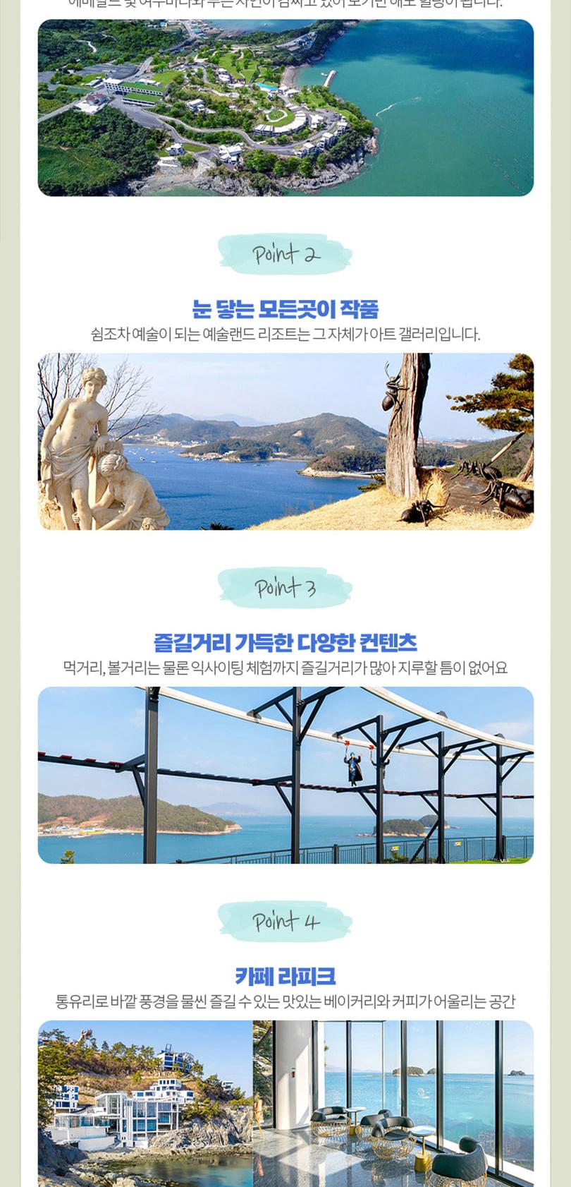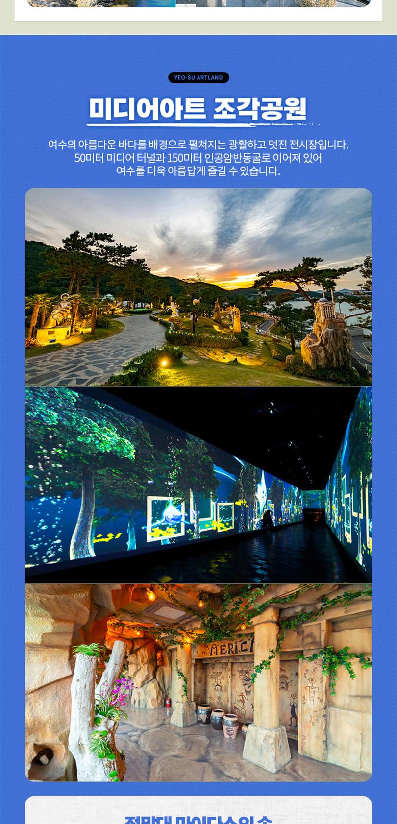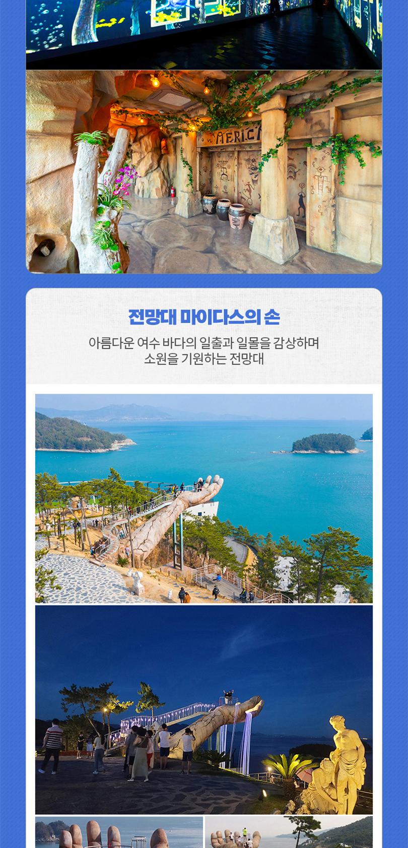 여수 예술랜드는 환상적인 여수 바다와 함께 다양한 구경거리와 익사이팅한 체험까지 모두 즐길 수 있는 공간으로 취향에 따라 조각공원과 트릭아트 뮤지엄 중 선택하여 즐길 수 있어요. 특히 조각공원에는 여수 바다의 일출과 일몰을 한눈에 담을 수 있는 전망대인 마이다스의 손이 있으니 전망대에서 소원을 빌어보세요.