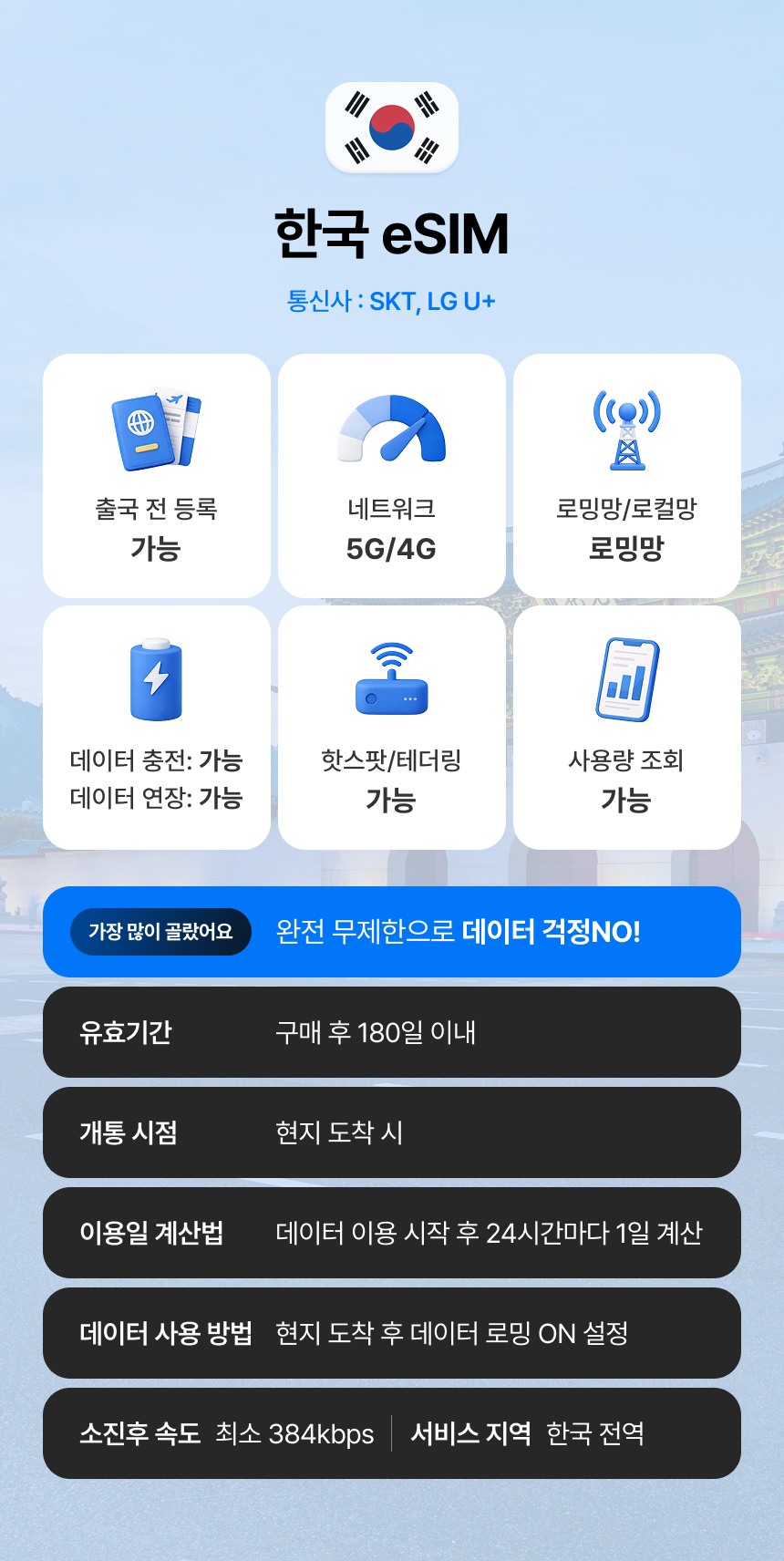 여행 중 필수로 필요한 데이터! 여행을 편안하게 시작하고 싶다면 데이터 eSIM을 추천해요. 별도의 SIM 교체 없이 스마트폰 설정만으로 이용이 가능한 상품이에요. 무거운 공유기는 더 이상 들고 다니지 마세요! 더욱더 가볍고 편리하게, 그리고 저렴하게 여행을 시작해 보세요.