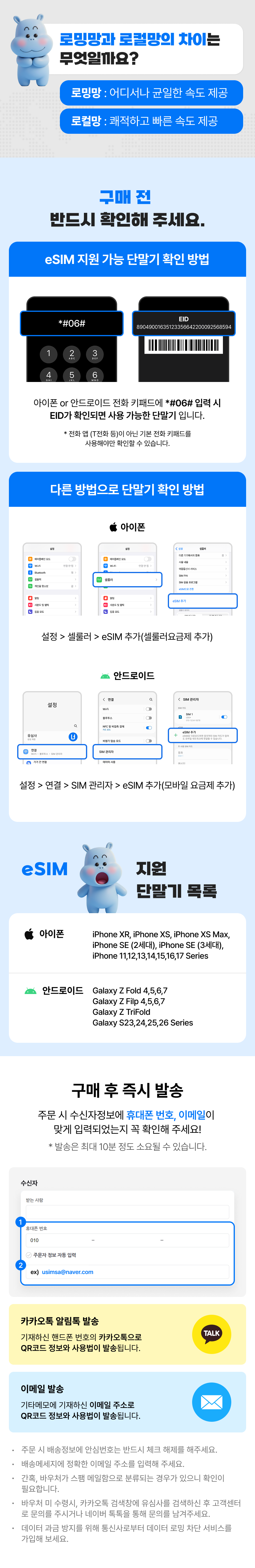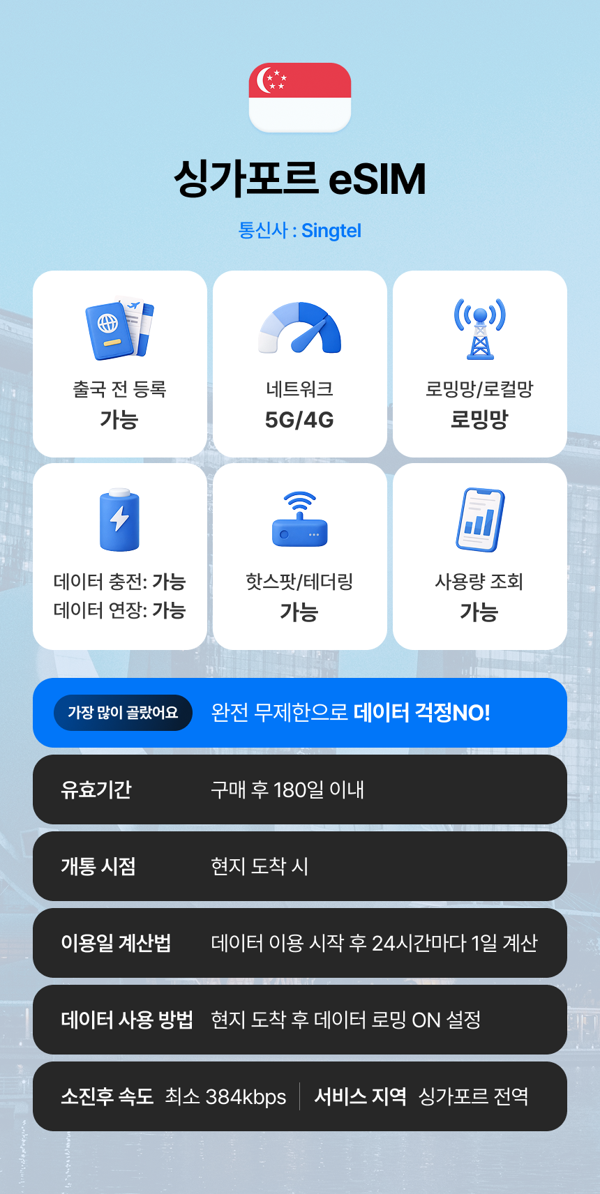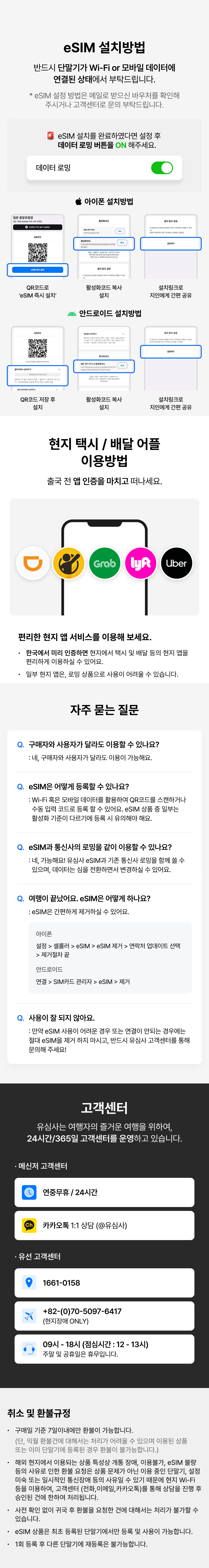 여행 중 필수로 필요한 데이터! 여행을 편안하게 시작하고 싶다면 데이터 eSIM을 추천해요. 별도의 SIM 교체 없이 스마트폰 설정만으로 이용이 가능한 상품이에요. 무거운 공유기는 더 이상 들고 다니지 마세요! 더욱더 가볍고 편리하게, 그리고 저렴하게 여행을 시작해 보세요.
