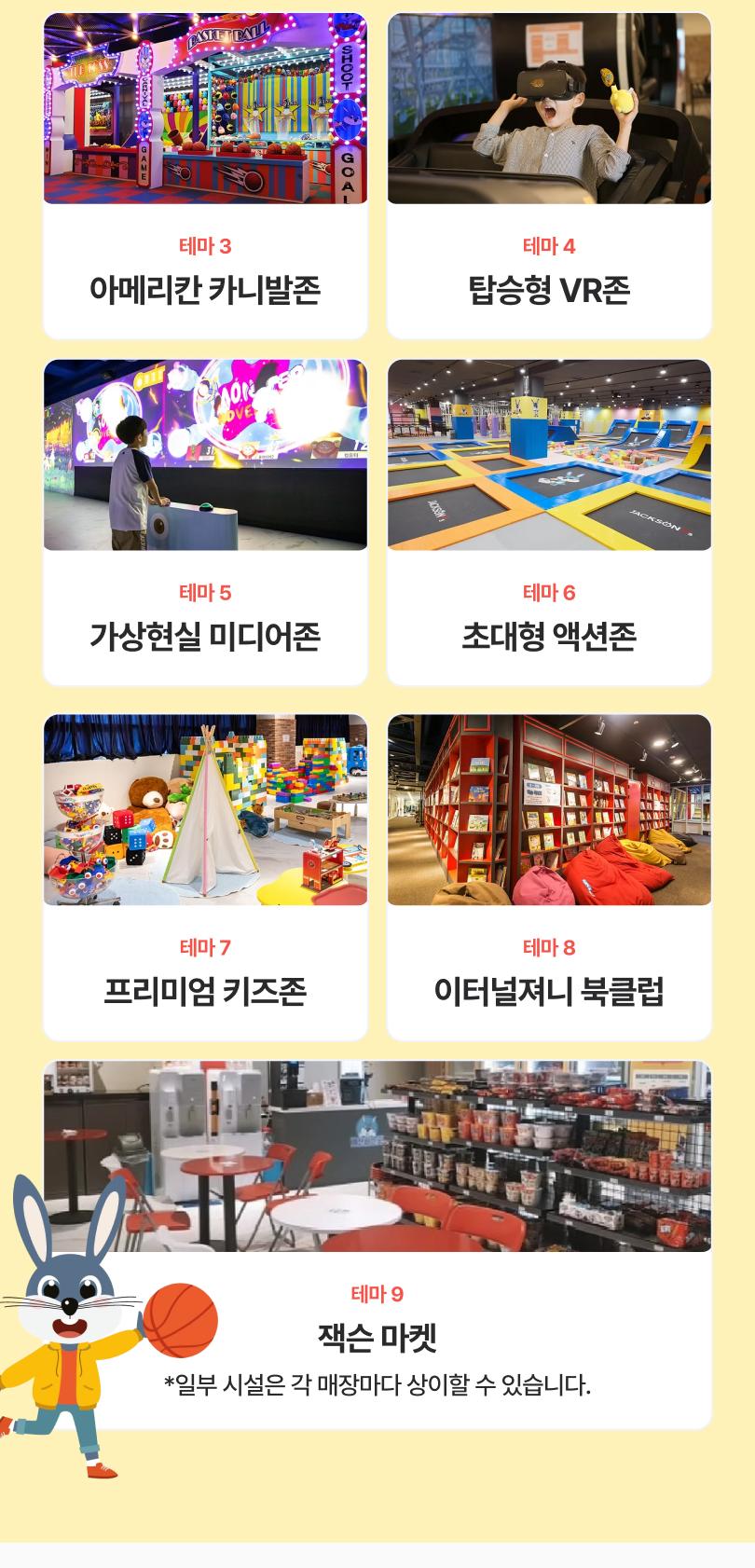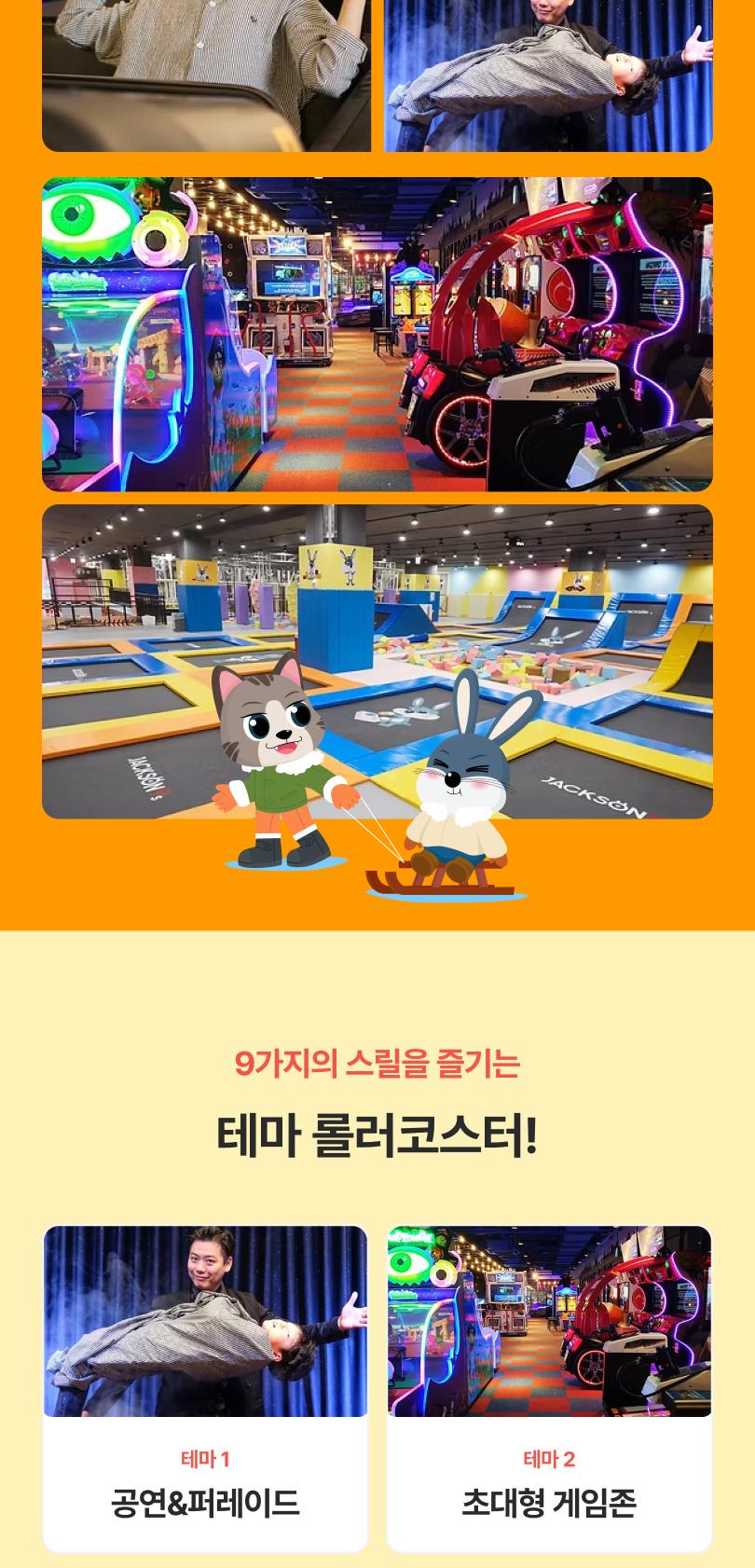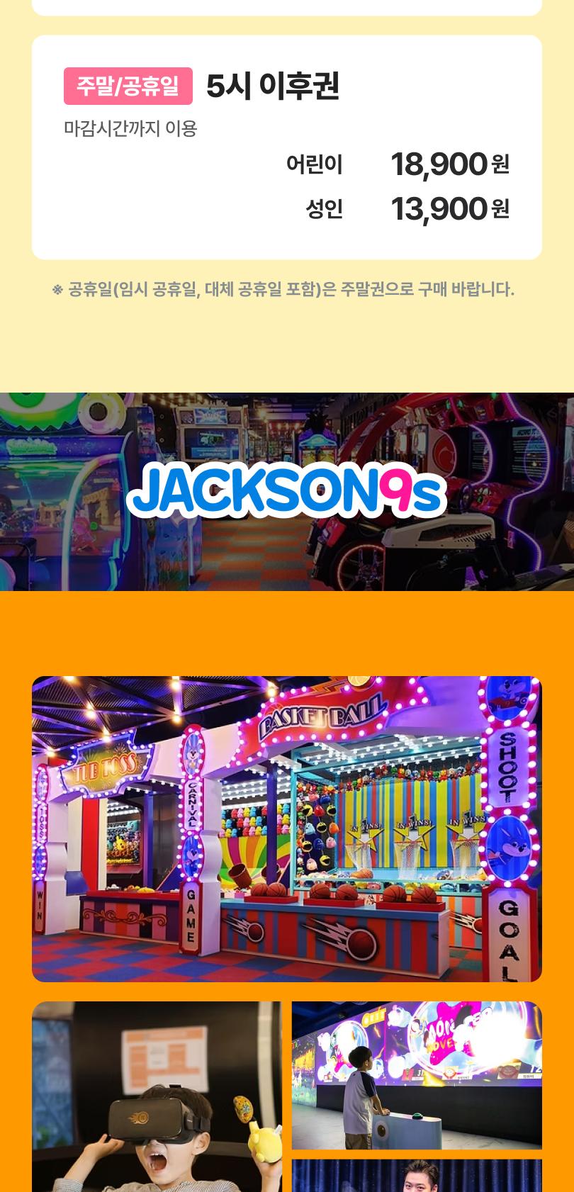 한국어 제공더 재미있고 더 청결하고 더 신나게 돌아온 잭슨나인스를 소개합니다. 입장권 하나로 최신 게임존 전체를 무료로 이용할 수 있어요. 365일 얼음세상! 아이스힐 슬로프를 만나고, 다양한 인형들을 뽑을 수 있는 카니발존에서 멋진 추억을 만들어 보세요. 내부의 9여개의 ZONE에서 다양한 놀이시설을 즐길 수 있어요.