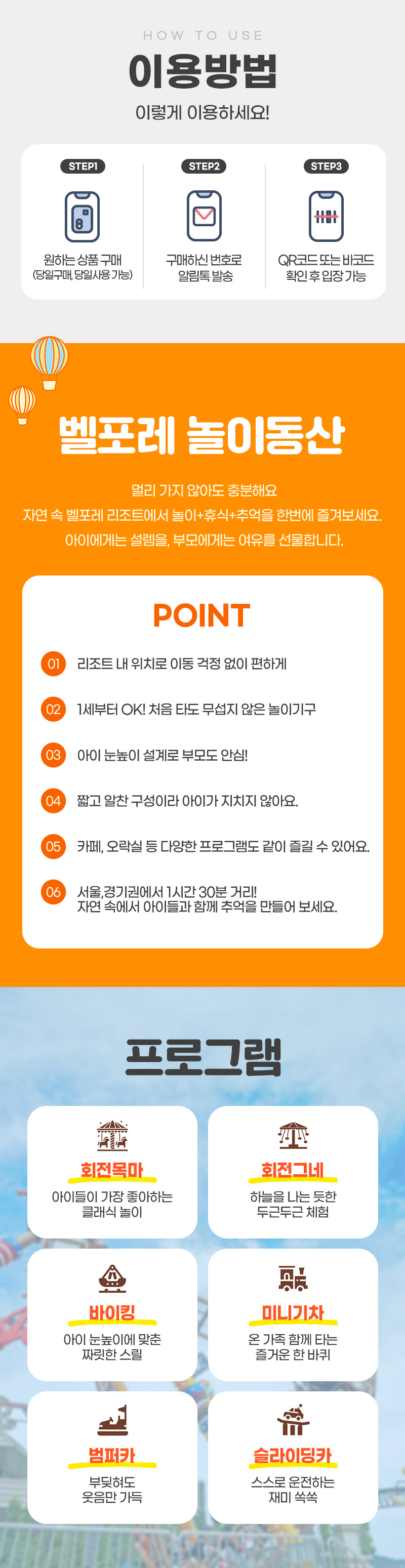 1세부터 이용 가능한 놀이기구와 아이 눈높이에 맞춘 안전한 설계로 처음 놀이기구를 타는 아이도 부담 없이 즐길 수 있어요. 무섭지 않은 난이도와 짧고 알찬 구성 덕분에 아이가 지치지 않고 끝까지 즐길 수 있으며, 부모도 안심하고 함께 시간을 보낼 수 있답니다.