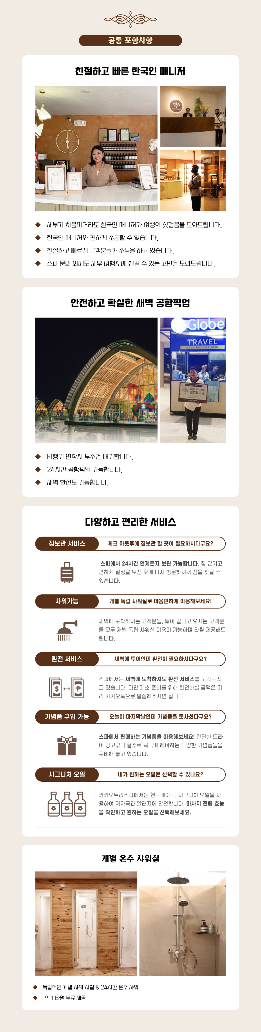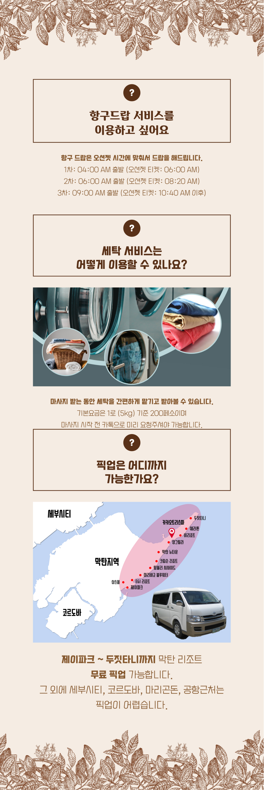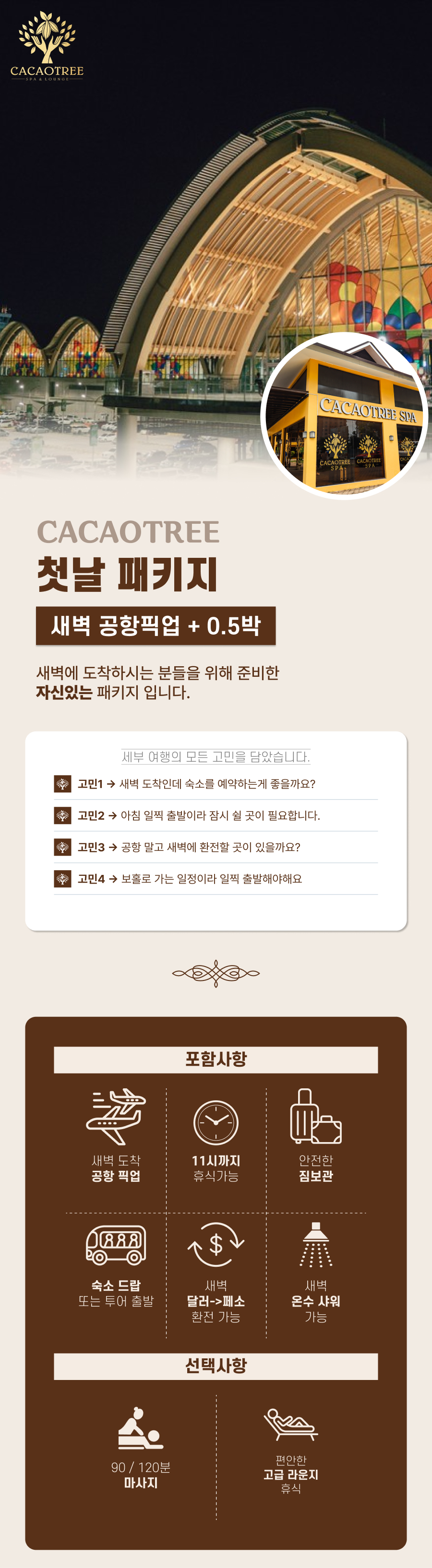 세부 여행하시는 고객분들의 모든 고민을 담았습니다! 세부 카카오트리 스파 첫날팩은 (저녁,새벽) 공항픽업 + 숙박 +짐보관 + 숙소드랍 서비스를 제공해요! 저녁 늦은 시간 또는 이른 새벽시간 도착 비행기도 문제없이 다 픽업해드려요. 비행의 피로를 풀어주는 마사지와 함께 다음날 아침까지 수면 할 수 있어요. 마사지는 시아추, 타이, 오일, 라바스톤 마사지 등 다양한 프로그램 중 원하는 옵션을 선택할 수 있어요.