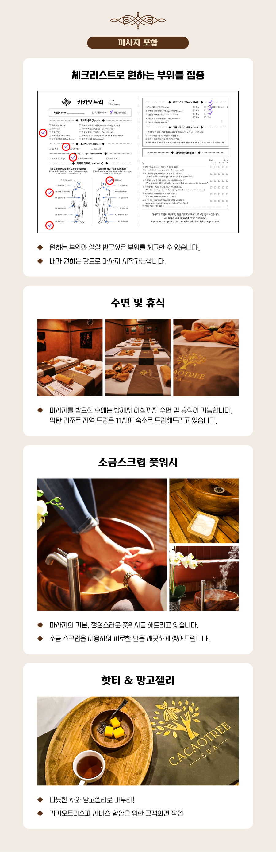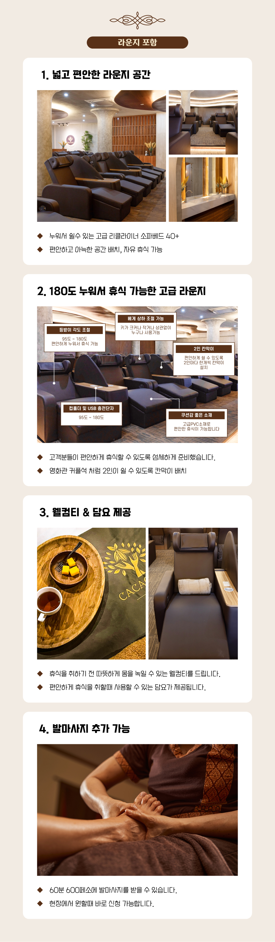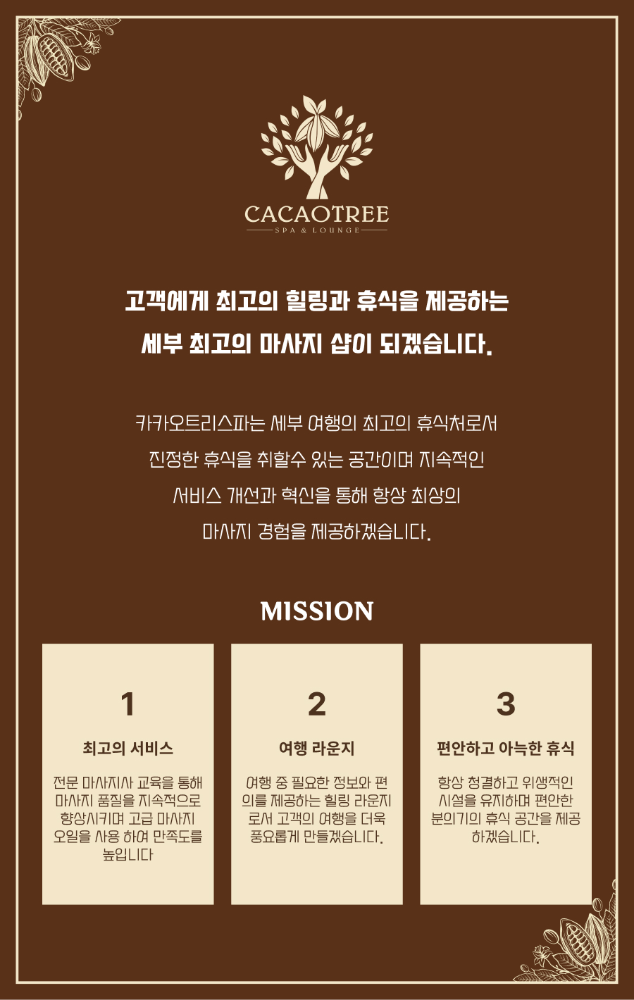 세부 여행하시는 고객분들의 모든 고민을 담았습니다! 세부 카카오트리 스파 첫날팩은 (저녁,새벽) 공항픽업 + 숙박 +짐보관 + 숙소드랍 서비스를 제공해요! 저녁 늦은 시간 또는 이른 새벽시간 도착 비행기도 문제없이 다 픽업해드려요. 비행의 피로를 풀어주는 마사지와 함께 다음날 아침까지 수면 할 수 있어요. 마사지는 시아추, 타이, 오일, 라바스톤 마사지 등 다양한 프로그램 중 원하는 옵션을 선택할 수 있어요.