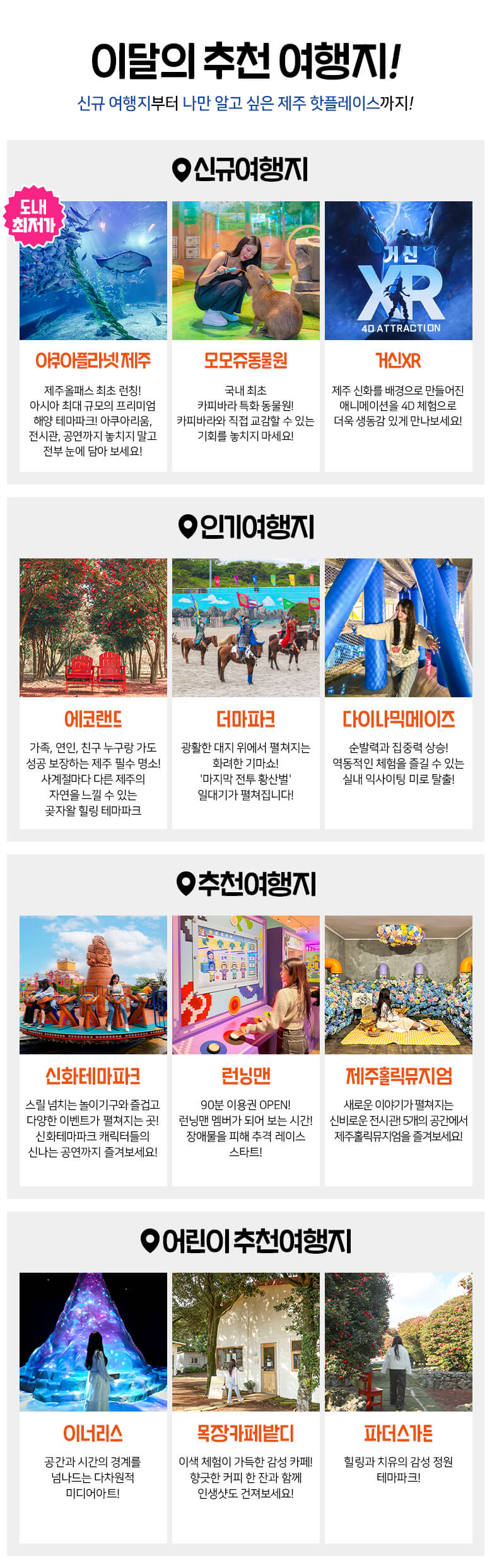 에메랄드빛 해변과 천혜의 자연경관을 자랑하는 제주도! 티켓 하나로 쉽고 간편한 제주 여행을 떠나볼까요? 수려한 테마파크부터 스릴감 있는 어트랙션과 색다른 워터쇼까지 즐길 수 있어요. 특히, 올패스만의 여름 시즌 이벤트! 시원하고 짜릿하게 즐기는 주상절리 제주제트로 무더위를 날려보세요.
