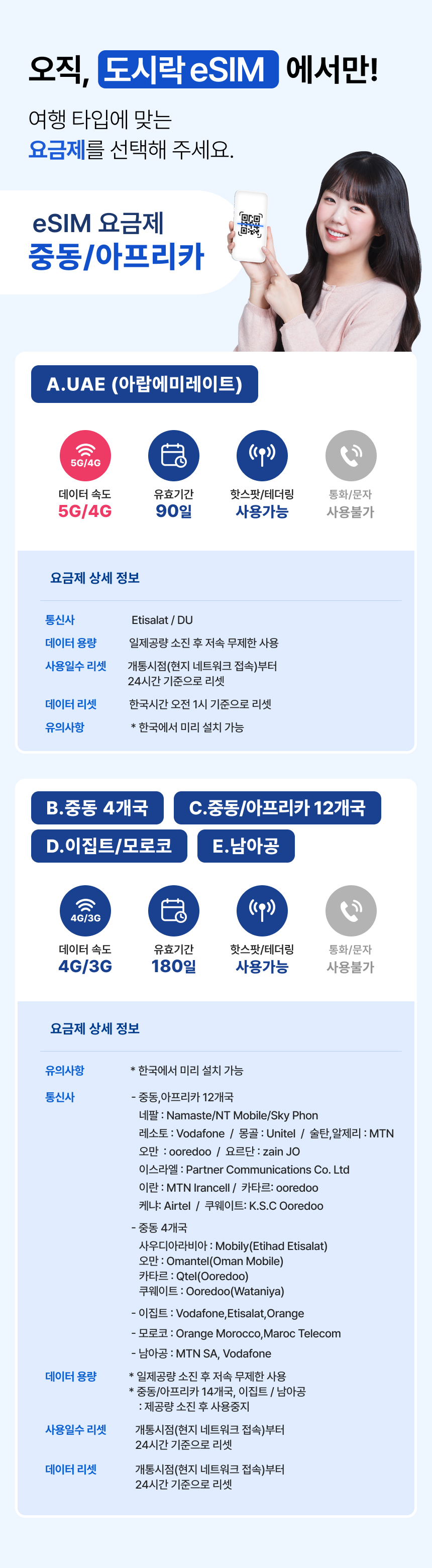 주문 이후 24시간 안에 QR코드를 전달드려 수령할 필요 없이 바로 사용이 가능한 eSIM을 소개해요. 기존 SIM 카드를 분리하고 따로 보관할 필요가 없으며 파손, 분실 걱정 없어 더욱 편리하게 사용할 수 있어요. 합리적인 가격과 현지 데이터만 구매해 이용할 수 있어 좋아요. 이제 구입 후 QR코드로 바로 휴대폰에 등록해 사용해 보세요!