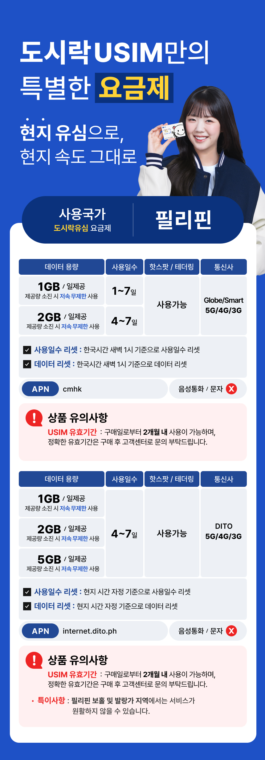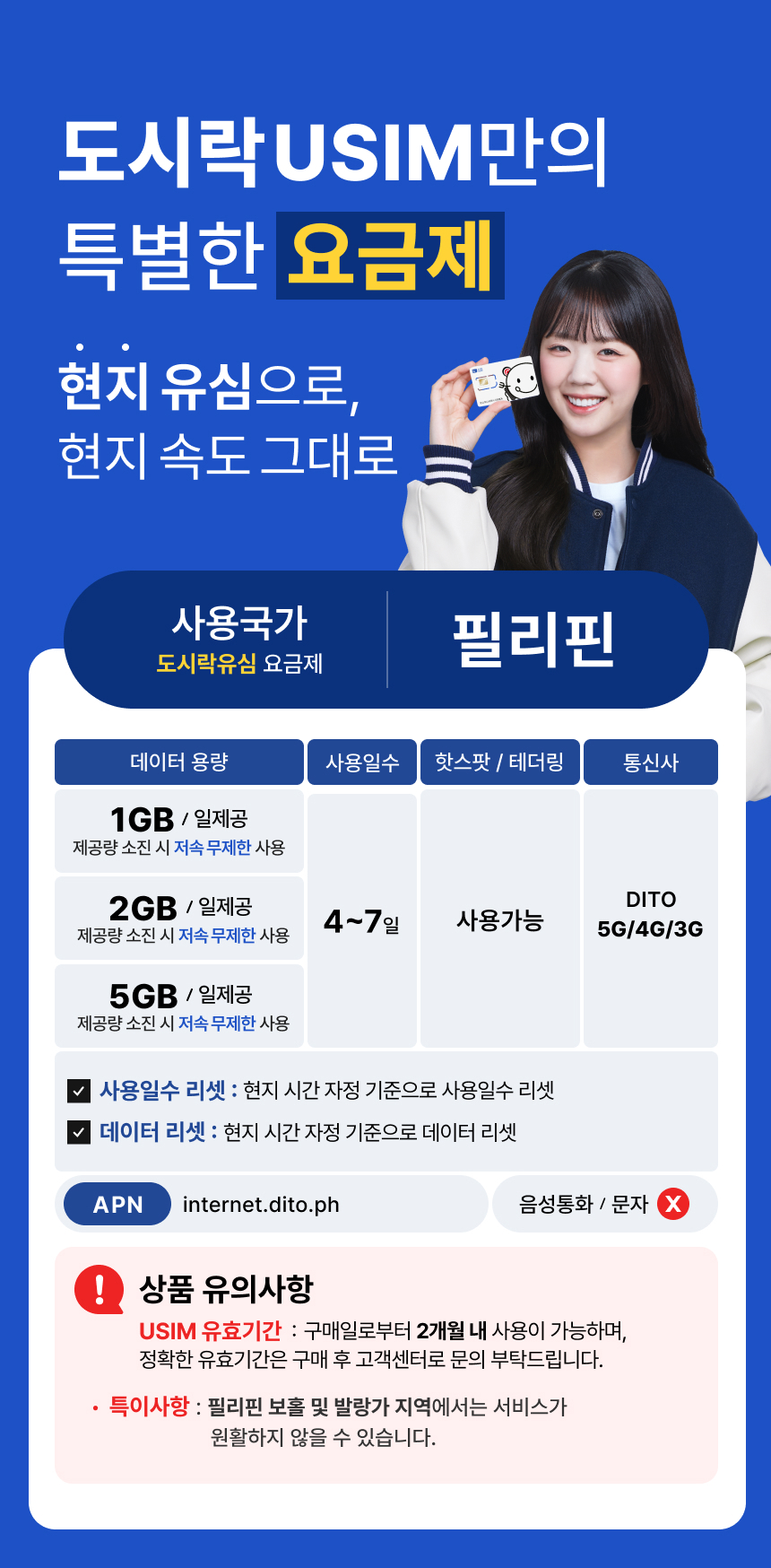 안 써본 사람은 있어도 한 번만 써본 사람은 없는 국내 최대, 최고의 로밍 전문기업 와이파이 도시락의 필리핀 유심을 소개해요. 현지 유심으로 사용하기 때문에 속도 걱정 없이 여행할 수 있어요. 넉넉한 데이터 용량은 물론이고, 와이파이 도시락은 전국 주요 공항 로밍센터를 운영하고 있어 더욱 편리하게 이용할 수 있어요.