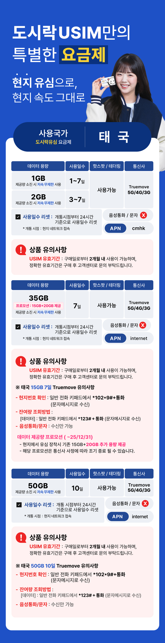 안 써본 사람은 있어도 한 번만 써본 사람은 없는 국내 최대, 최고의 로밍 전문기업 와이파이 도시락의 태국 유심을 소개해요. 현지 유심으로 사용하기 때문에 속도 걱정 없이 여행할 수 있어요. 넉넉한 데이터 용량은 물론, 와이파이도시락은 전국 주요 공항 로밍센터를 운영하고 있어 더욱 편리하게 이용할 수 있어요.