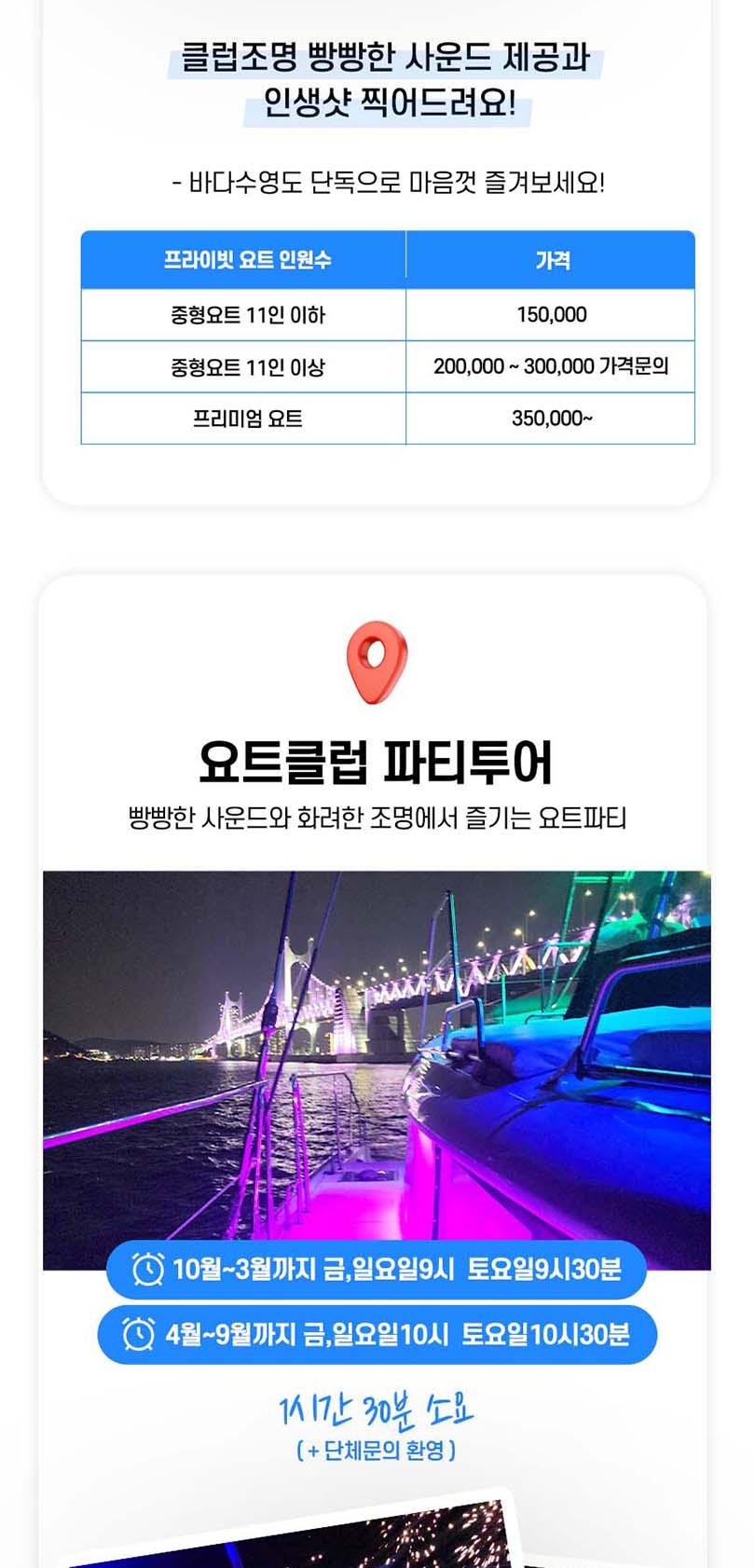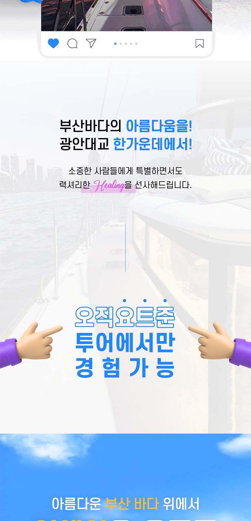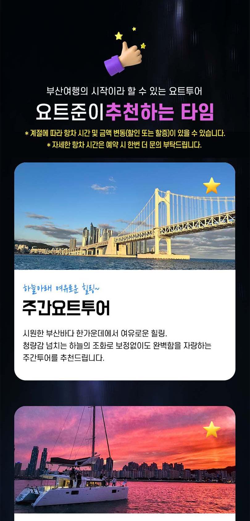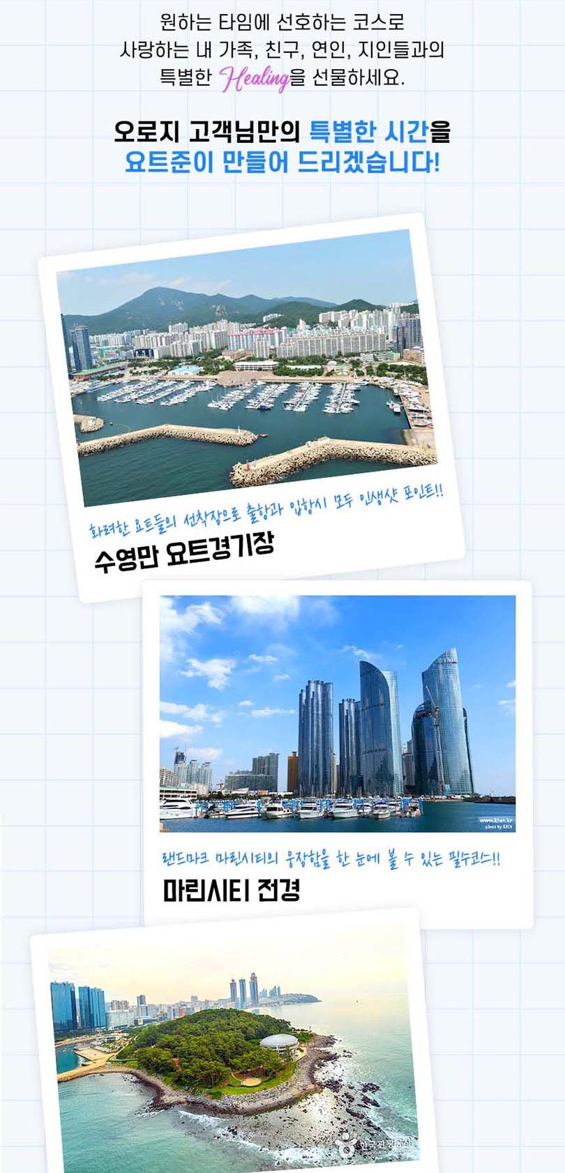부산 해운대 바다를 즐기는 요트투어를 찾는다면! 요트준과 함께 하세요. 프리미엄 급 요트는 물론 합리적인 가격, 요트에 어울리는 완벽한 음악과 야경까지 환상적인 시간을 보낼 수 있어요.