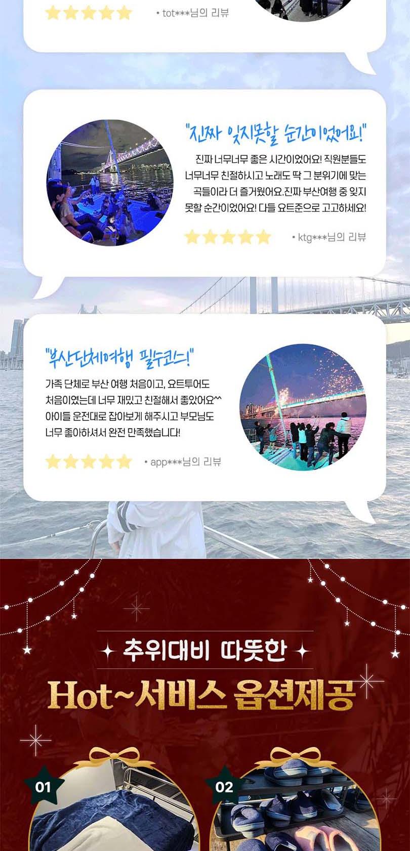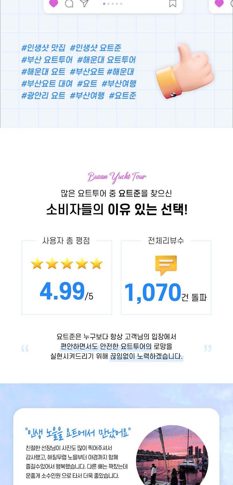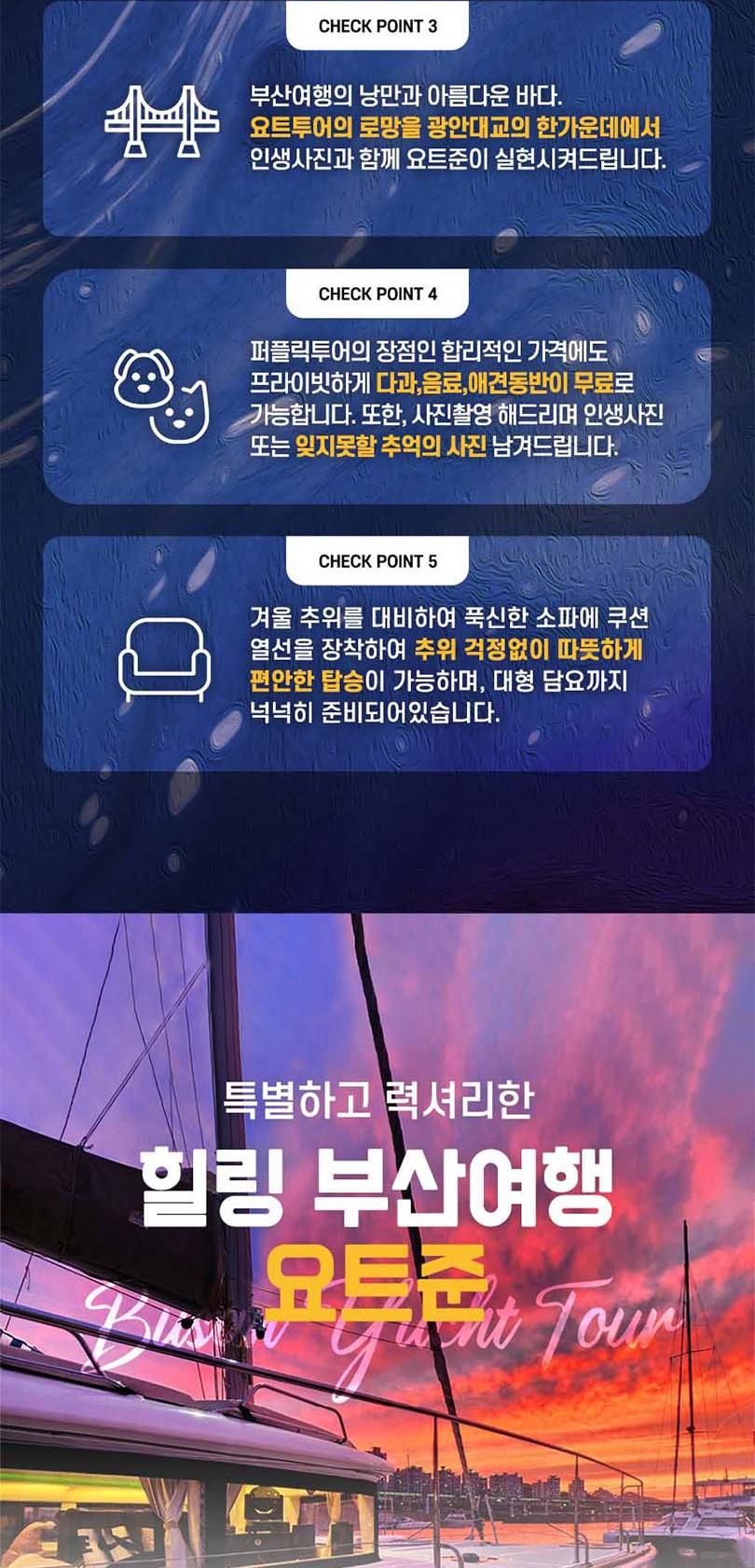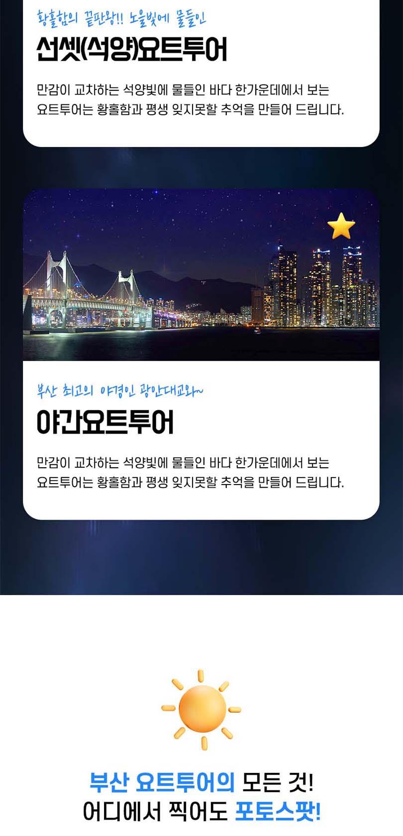 부산 해운대 바다를 즐기는 요트투어를 찾는다면! 요트준과 함께 하세요. 프리미엄 급 요트는 물론 합리적인 가격, 요트에 어울리는 완벽한 음악과 야경까지 환상적인 시간을 보낼 수 있어요.