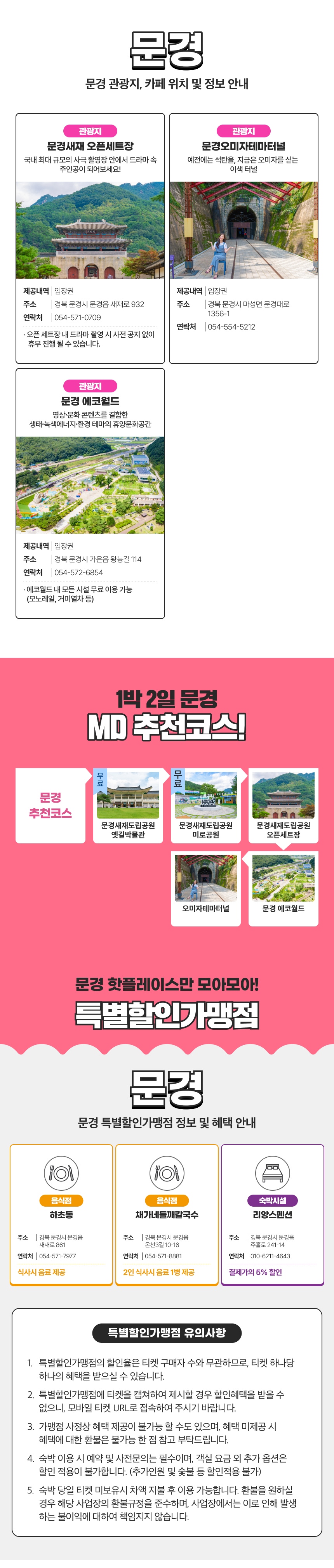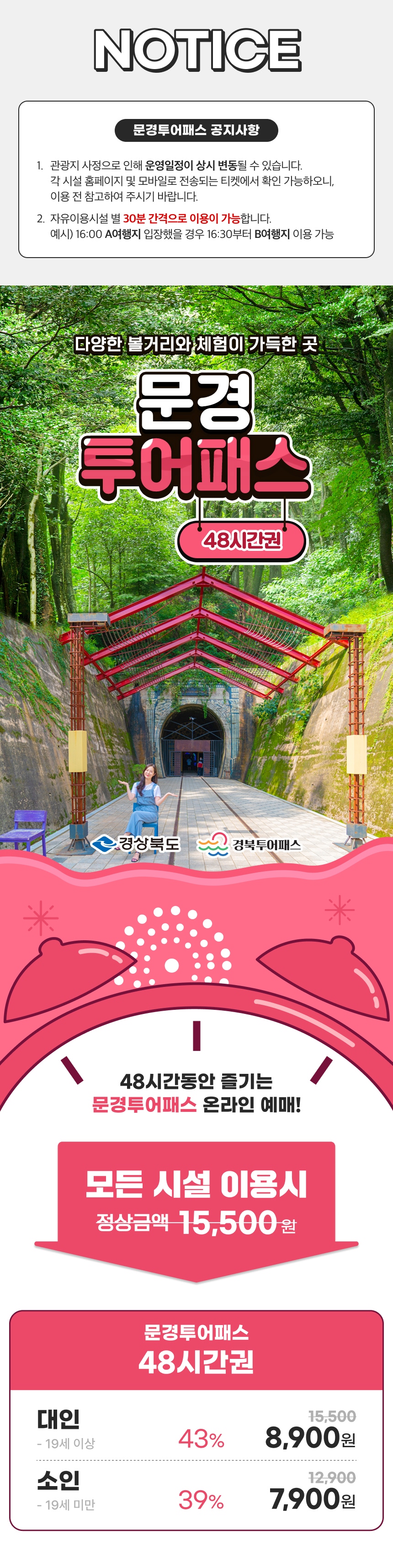 제휴처 중 두 곳만 방문해도 본전 이상을 뽑는 초특가 혜택의 투어패스와 함께 문경 여행을 떠나보세요! 해당 투어패스는 문경의 여러 제휴처를 48시간 동안 무료로 이용할 수 있을 뿐만 아니라 다양한 특별할인 가맹점에서의 할인 혜택도 받을 수 있는 갓성비 중의 갓성비 티켓이에요.