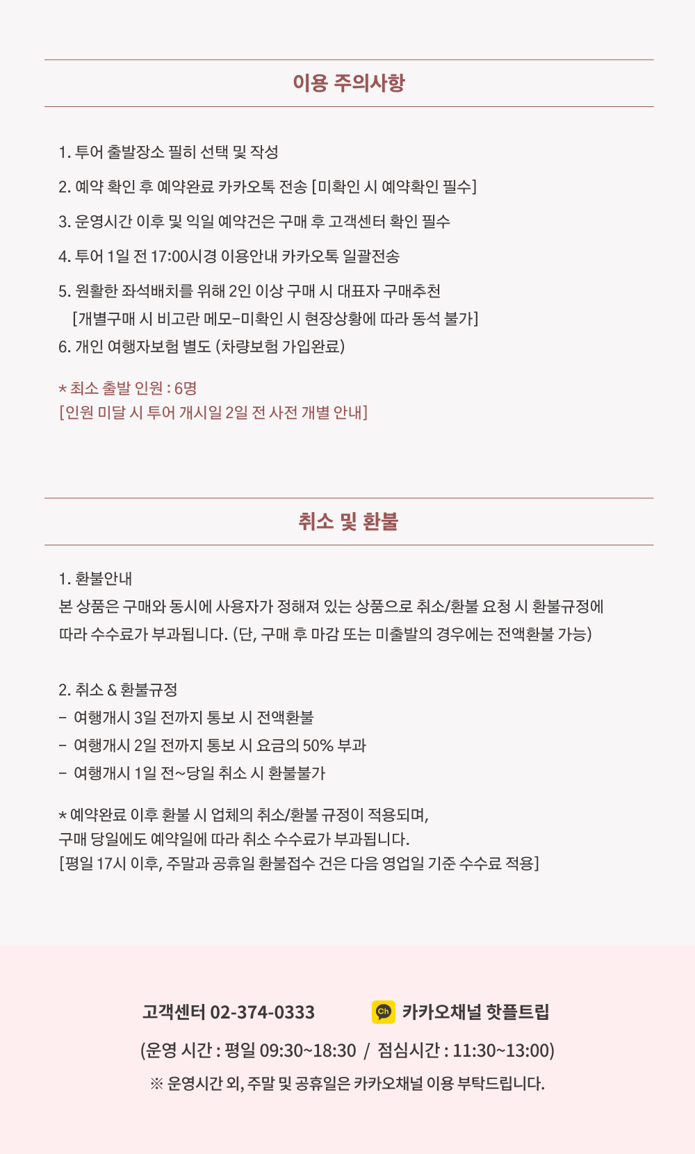 * 출발 5분 전까지 도착 부탁드립니다. 출발 시각 이후 도착 시 개별적으로 합류하여야 합니다.