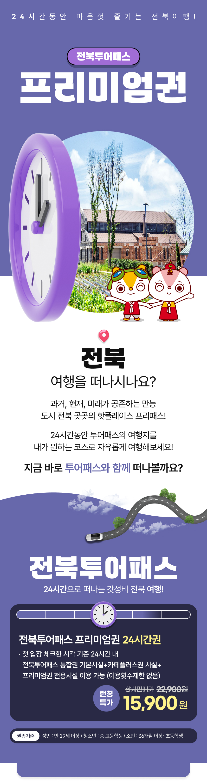 전북 여행을 계획 중이신가요? 24시간으로 떠나는 가성비 투어패스를 소개할게요. 첫 입장 체크한 시각 기준 24시간 내 통합권에 포함된 기본시설은 물론이고, 카페 플러스권의 시설과 프리미엄 전용 시설을 함께 이용할 수 있어요. 24시간 동안 무제한으로 다양한 관광지를 여행하고 커피 한 잔의 여유까지, 완벽한 여행을 만들어 보세요. 합리적인 가격으로 전북 여행을 떠나는 최고의 방법! 전북 투어패스 프리미엄권과 함께하세요.