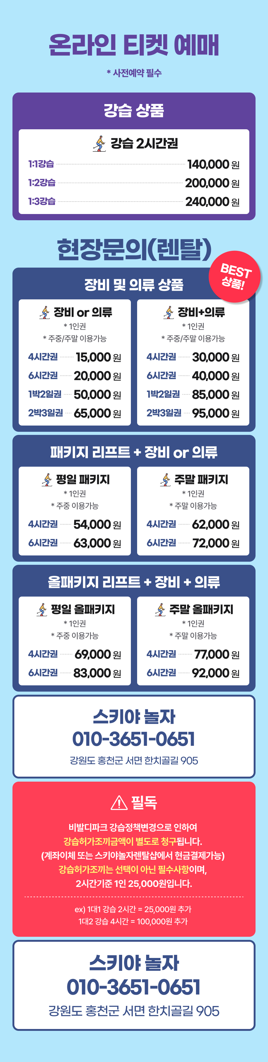 어린이/유아강습 전문 업체로서 다양한 커리큘럼과 노하우를 바탕으로 재밌고 안전한 강습을 진행해요. 비발디파크 정식 허가 및 책임보험 가입을 통하여 더욱 신뢰 있고 믿음 가는 강습을 선사할게요. 맞춤형, 수준별 강습이라 부담 없이 안심하고 배울 수 있어서 좋고, 강습 중 촬영된 사진과 영상을 네이버 밴드를 통해 제공하고 있어 따로 기록하는 번거로움 없이 오롯이 강습에만 집중할 수 있어요. 최고의 강사님들로 이루어진 비발디파크 '스키야놀자' 렌탈샵을 방문해 보세요!