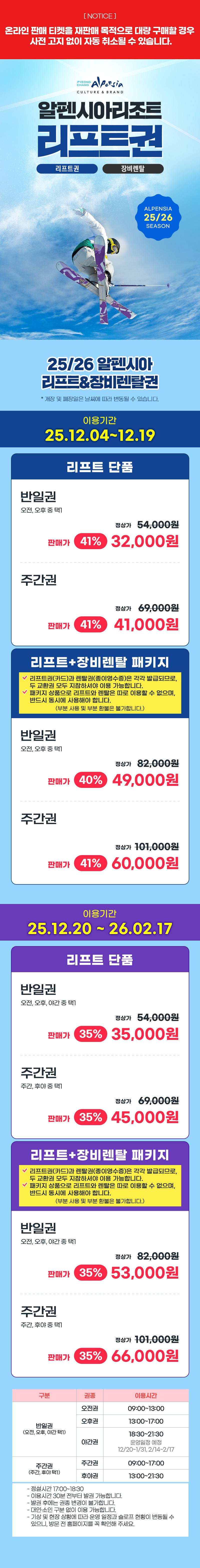 한국어 제공⛷️ 알펜시아 리프트·장비렌탈 얼리버드! 대관령의 겨울을 가장 합리하게 즐기는 방법, 지금만 누릴 수 있는 특별가로 스키 시즌을 시작하세요. ❄️✨ 판매기간 : 2025.11.21 ~ 2025.12.19 유효기간 : 2025.12.04 ~ 2025.12.19