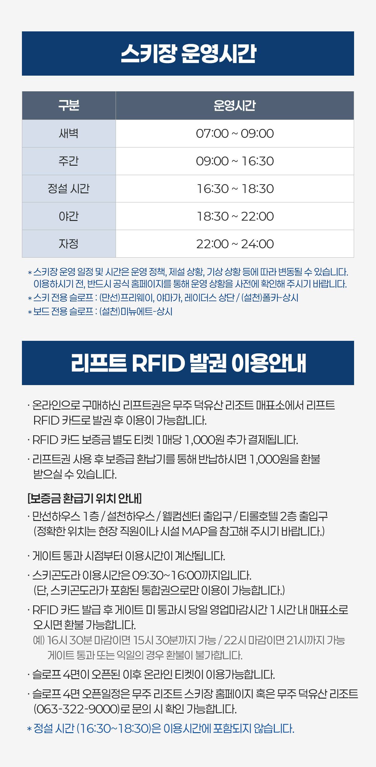 (새벽 및 자정스키 운영여부는 무주 덕유산 리조트 홈페이지 확인 부탁드립니다.)