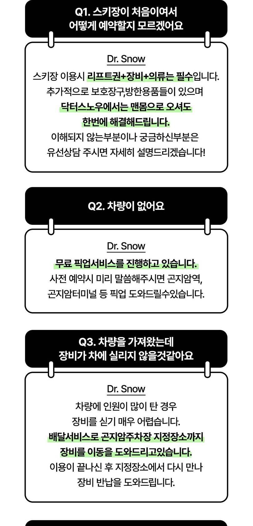 올겨울, 사랑하는 사람과 함께 행복한 스키여행을 떠나볼까요? BIG 재미를 책임질 닥터스노우 렌탈샵! 스키 및 보드 장비가 매 시즌 새롭게 입고되어 깨끗한 의류, 장비를 이용할 수 있어요. 스키장까지 차량으로 약 5분 거리! 뛰어난 편의성을 자랑한답니다.