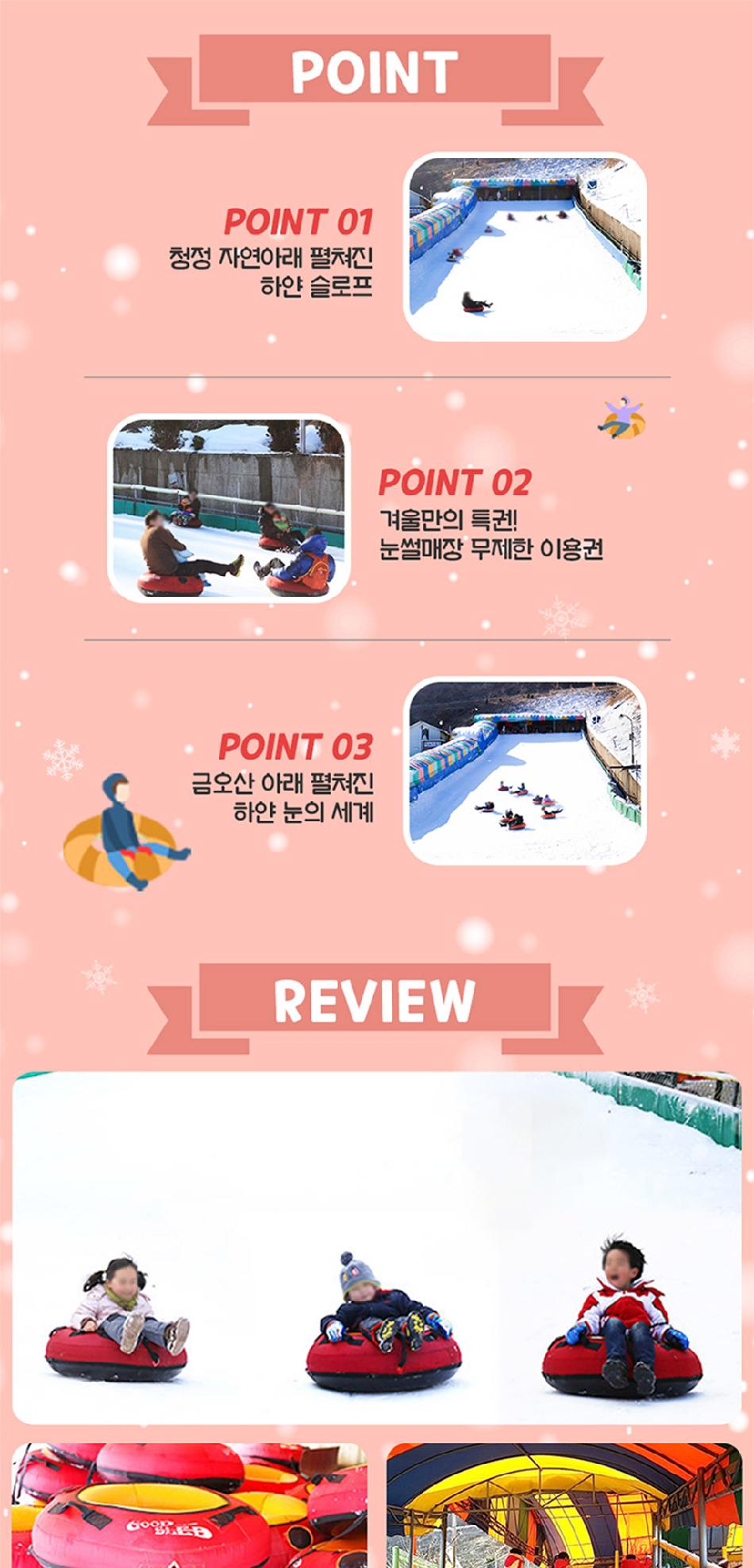 남녀노소 누구나 만족하고 좋아할 눈썰매장이 있어 시간 가는 줄 모르게 즐길 수 있어요. 눈썰매장을 무제한으로 이용하며, 언덕을 내려오는 속도와 짜릿함을 즐겨 보세요! 캠핑장, 식당 등 부대시설 또한 모두 갖춰져 있으니 금오산랜드 캠핑장 또한 추천해요.