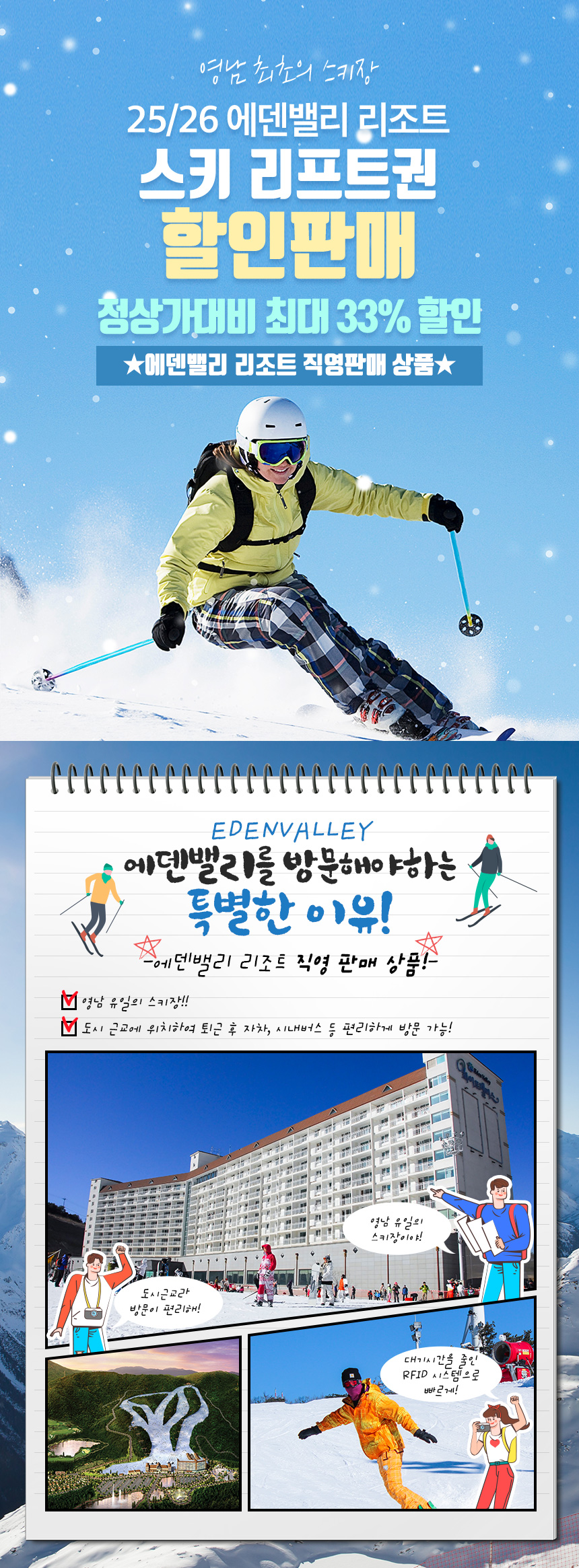 겨울만 오면 멀리 가지 않아도 되는 이유가 생깁니다. 도심 근처에서 만나는 설경, 한 시간이 채 안 되는 이동만으로 스키와 눈을 즐길 수 있는 특별한 곳, 영남 최고의 도시 근교 스키장. 올 겨울은 에덴밸리 리조트에서 가볍게, 그러나 제대로 즐겨보세요. ❄️🎿⛷️