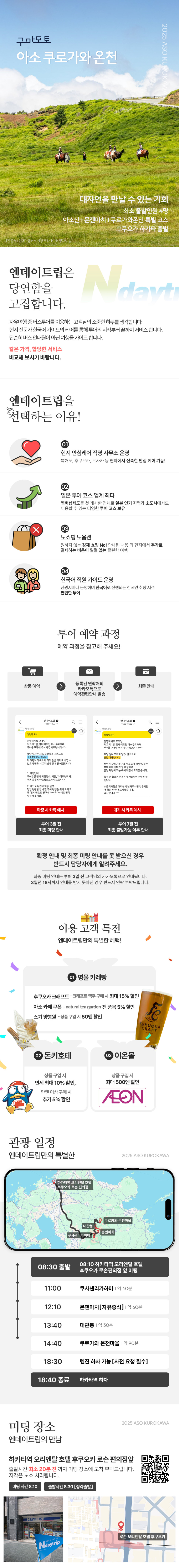 큐슈를 대표하는 아소산과, 다양한 온천을 즐기고 싶은 분들을 위해 준비한 투어예요. 하카타 역에서 투어를 시작해 쿠사센리가하마, 아소신사, 대관봉 그리고 쿠로키와 온천까지 하루만에 일본의 자연을 만나는 투어로 NO 쇼핑, NO 옵션, NO 팁으로 운영되기 때문에 만족도도 최상이에요!