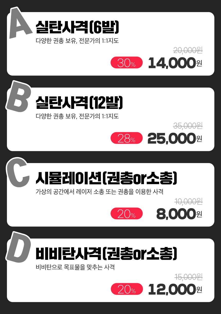 최신식 장비와 철저한 안전시설을 갖춘 제주 실탄사격장에서 현실 속 액션을 경험해보세요. 방탄복과 귀마개 등 안전장비 착용 후, 안전요원의 친절한 교육을 통해 총을 쥐는 법부터 정확한 사격 자세까지 배울 수 있습니다. 남녀노소 누구나 즐길 수 있는 이색 체험으로, 실제 실탄 사격뿐 아니라 학생과 가족 단위 고객을 위한 BB탄 사격과 시뮬레이션 사격존도 마련되어 있어요.