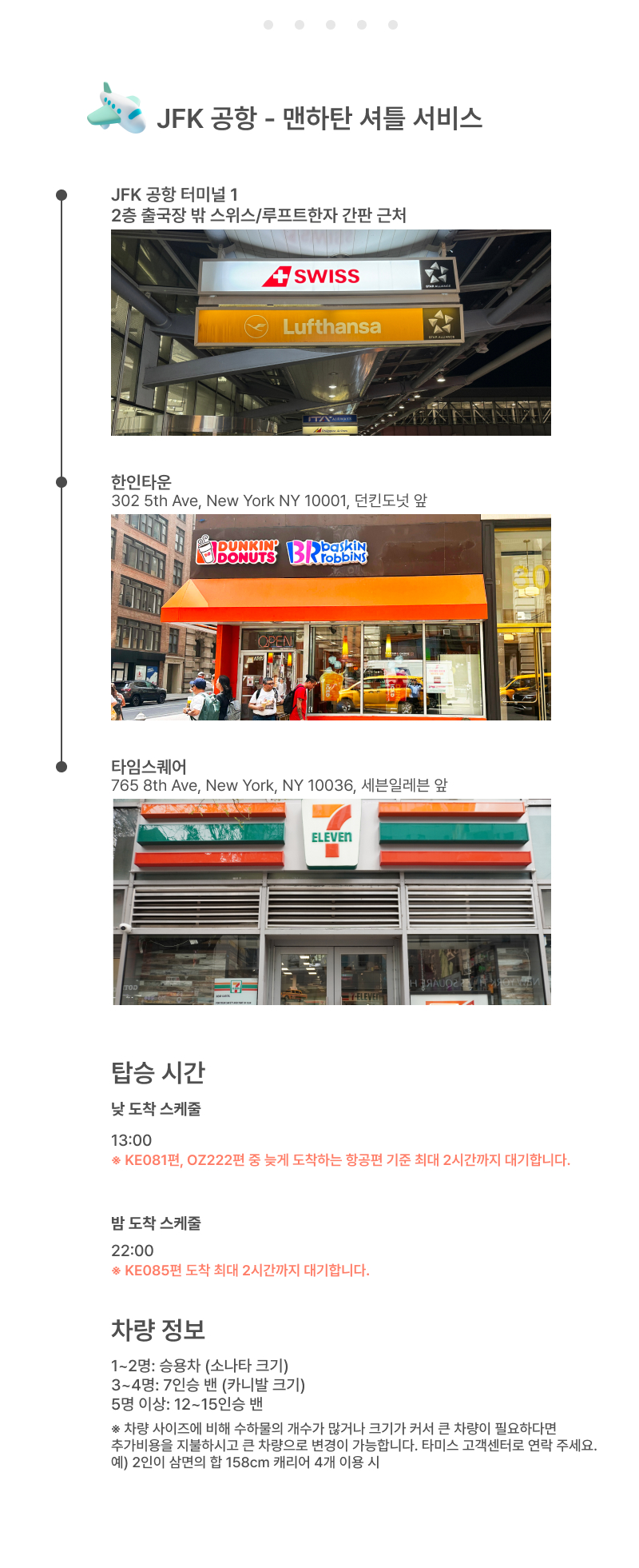 뉴욕 여행을 시작하려면 꼭 들려야 하는 공항! JFK 공항에서 맨하튼까지 이동하는 게 막막한 분들을 위해 추천드리는 셔틀 차량 서비스랍니다. 공항에서 탑승 후 맨하튼 한인 타운이나 타임 스퀘어 중 선택해 원하는 곳에서 하차가 가능하기 때문에 복잡한 뉴욕 여행을 보다 편하게 시작할 수 있어요. 캐리어도 1인 2개까지 가지고 탑승할 수 있기 때문에 더 이상 무거운 짐을 들고 대중교통을 이용하는 불필요한 체력 소모를 줄일 수 있어요.