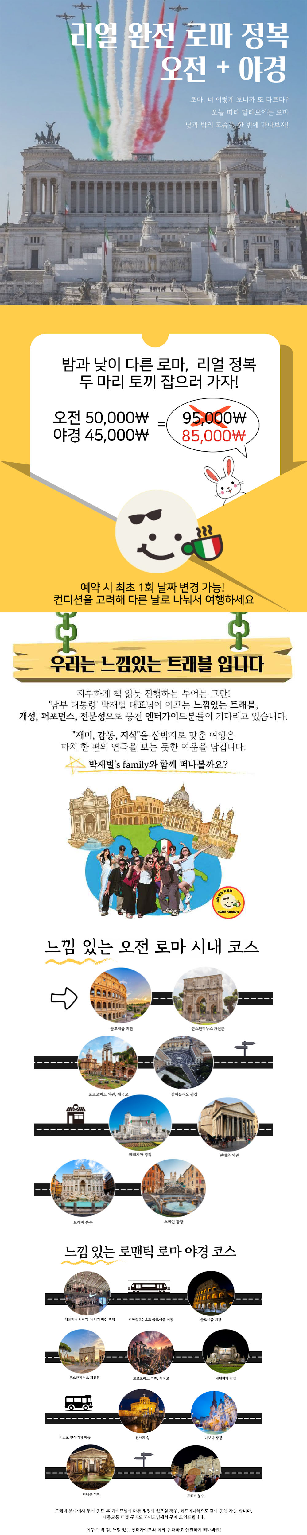 로마 시내 오전 투어와 야경 투어까지 하루만에 모두 함께할 수 있는 박재벌 패밀리 느낌있는트래블의 투어를 소개해요. 로마의 햇빛과 별빛 사이! 오전 시내 투어와 야경 투어를 한 번에 더 합리적인 비용에 진행하는 기획 투어예요. 엔터테이너+가이드 = 엔터 가이드! 박재벌 가이드 패밀리의 실력 검증된 최고의 엔터 가이드가 함께한답니다.
