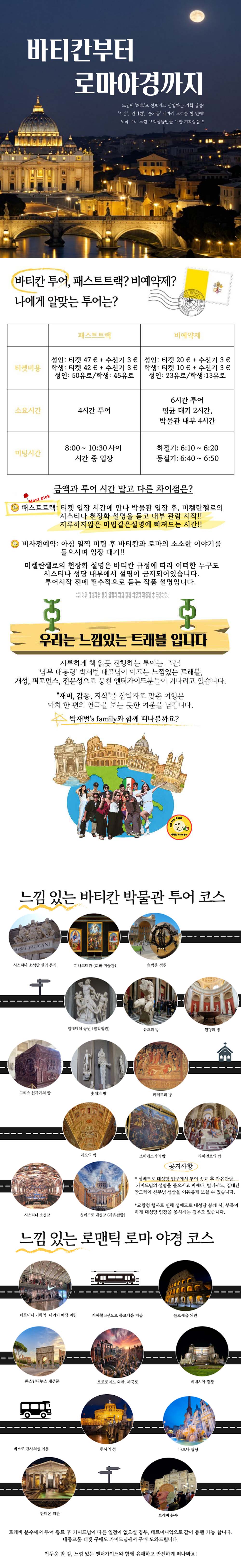 엔터테이너+가이드 = 엔터 가이드! 박재벌 가이드 패밀리의 실력 검증된 최고의 엔터 가이드가 함께하는 기획 투어를 소개해요. 바티칸 투어와 로마 시내 야경 투어를 어차피 할 예정이라면 한 번에 더 저렴한 가격에 예약할 수 있는 기획 투어예요.