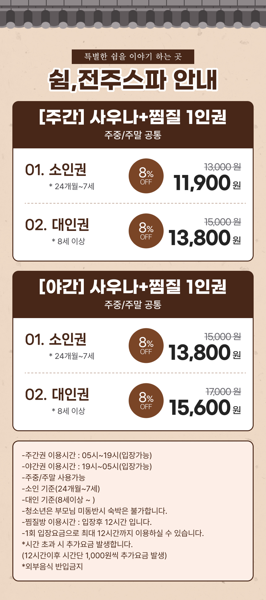 쉼, 전주스파는 전주한옥 마을과 10분 거리에 위치하고 있어 접근성이 좋아요. 그리고 쉼, 전주스파는 혈액순환, 신체적 혹은 정신적 질환에 좋은 황금토르말린찜질, 황토찜질, 소금석찜질, 불가마, 산림욕방, 얼음방, 토굴방, 힐링방 총 8개의 힐링공간으로 나누어져 있어요. 8개 방 마다 효능의 차이가 있기에 내 몸에 맞게, 내 취향에 맞춰 골라 다양한 컨셉의 찜질을 즐겨보세요. 물론 찜질 및 사우나 외에도 오락실, 가족방, 유아놀이방 등 편다양한 부대시설이 완비되어 있으니 편리하게 이용할 수 있어요.