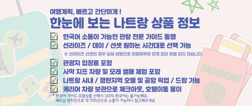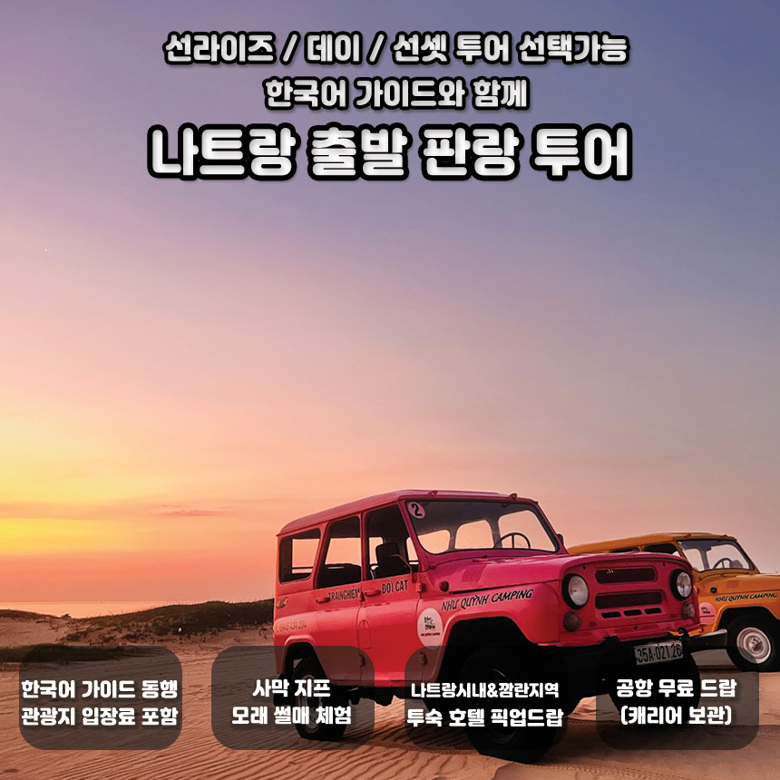 나트랑에서 제일 가까운 판랑 사막은 무이네 못지않은 아름답고 광활한 사막을 만날 수 있어요. 판랑 사막 이외에도 쫑선사원, 416광장, 양떼 목장 등 다양한 관광지를 둘러보며 알찬 코스로 짜여진 판랑 사막투어를 즐겨보세요!