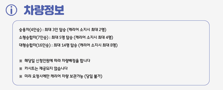 - 승용차 (4인승) : 최대 2인 (기아, 토요다 등)