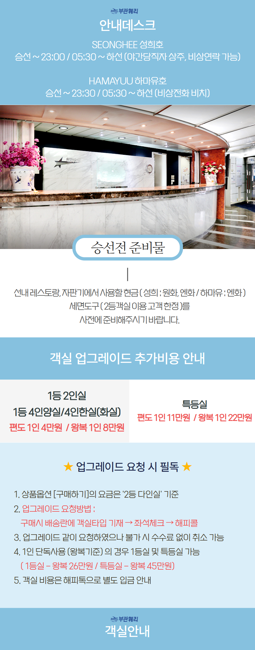 *부산항 승선 수속 안내 : 투어땅과 미팅하여 승선권 수령 - 출국장에서 여권 및 승선권 제시 - 출국심사 - 면세점 및 면세품인도장 이용 - 탑승