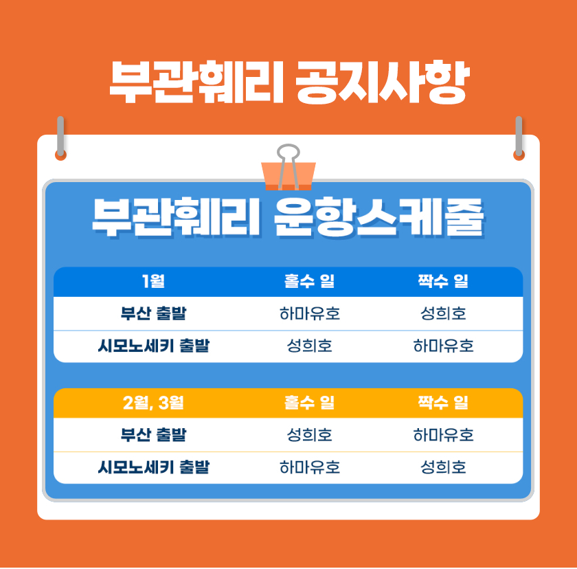 * 이용 당일, 오후 17:00 까지 부산항 국제여객터미널 3층 부관훼리 카운터 앞 집결 (시간엄수)