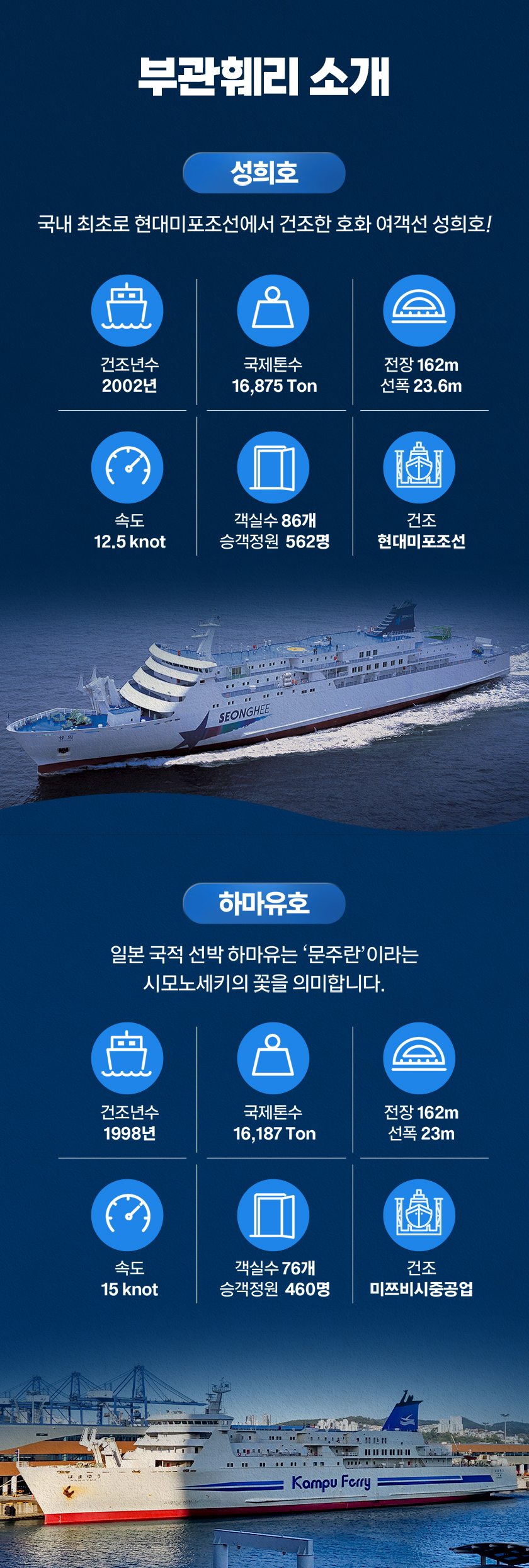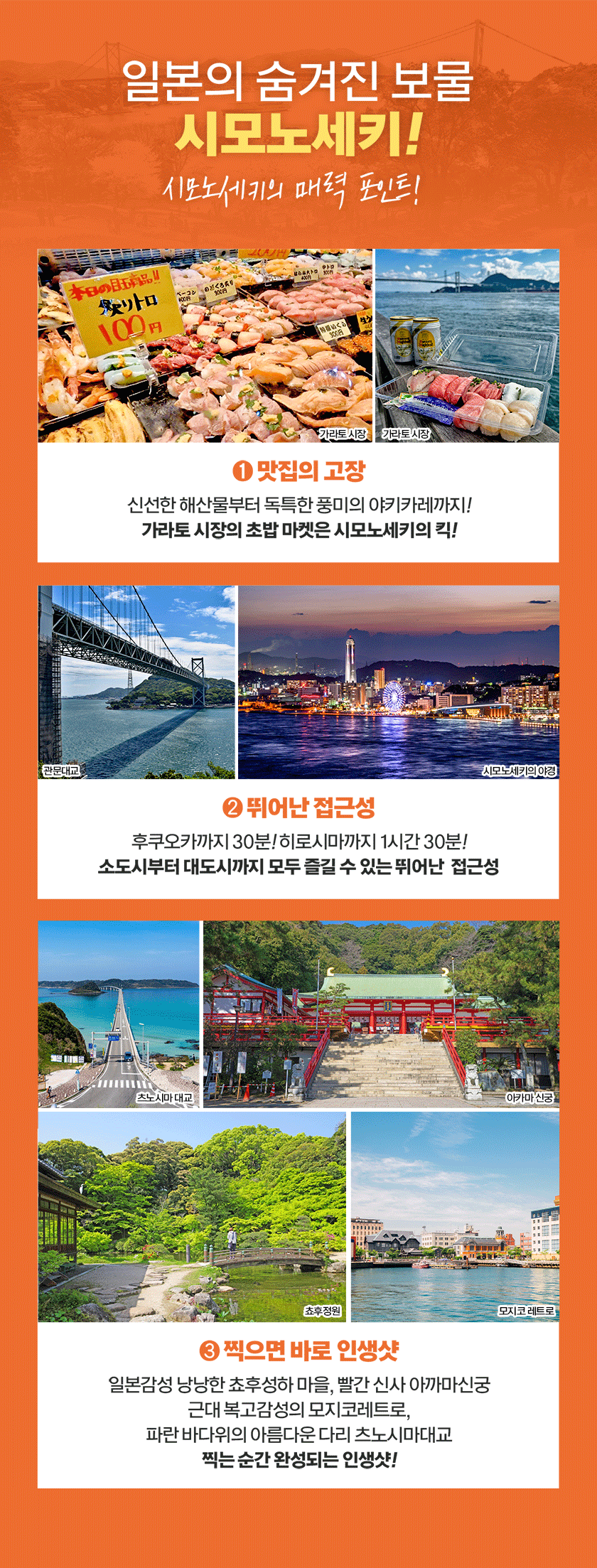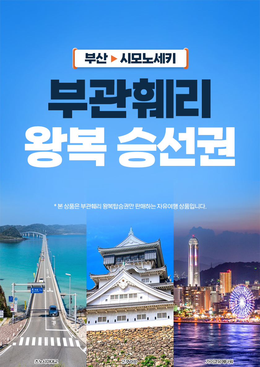 도착지인 시모노세키는 신선한 해산물과 지역 명물 야키카레로 잘 알려진 미식의 도시이자, 후쿠오카까지 약 30분, 히로시마까지 약 1시간 30분이면 이동 가능한 뛰어난 접근성을 갖춘 곳으로, 소도시 감성과 대도시 여행을 함께 즐기기 좋은 출발점이에요. 밤 시간대에 승선해 자는 동안 이동하고 아침 도착 후 바로 여행을 시작할 수 있어 이동 시간을 효율적으로 활용할 수 있으며, 왕복 탑승권으로 이용해 귀국 일정까지 한 번에 계획할 수 있어 더욱 편리해요.