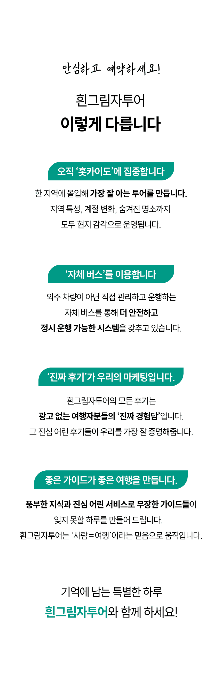 홋카이도의 눈부신 겨울에 빠지는 힐링되는 하루, 아름다운 눈을 체험할 수 있는 소규모 눈체험 투어를 추천해요. 30인 한정으로 대형 버스(49인 또는 45인 버스)로 진행돼서 투어 진행 동안 편안하게 휴식을 취하면서 여행이 가능해요.